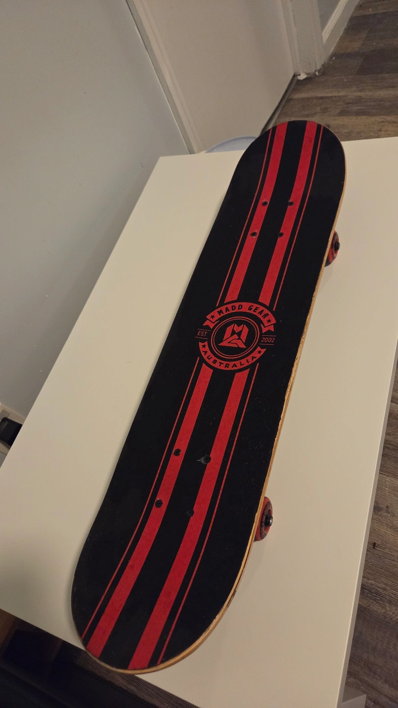 Complete skateboard. Cool gorilla graphic. Red and black deck. Good condition. Wheels and trucks included.