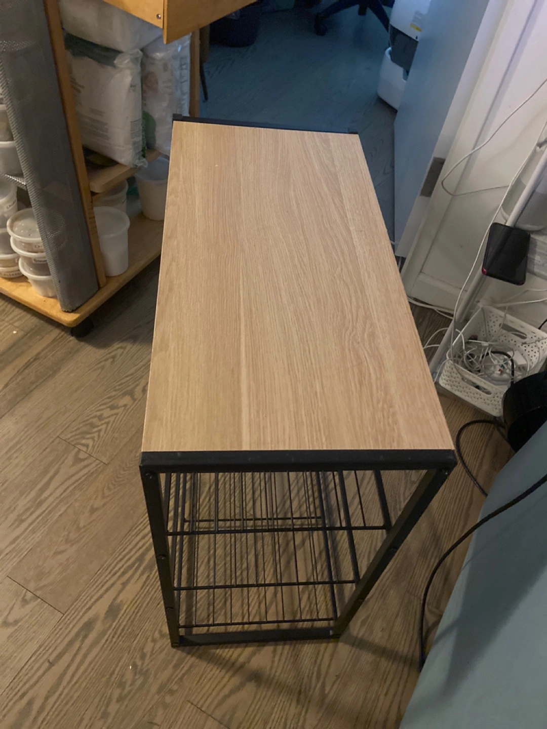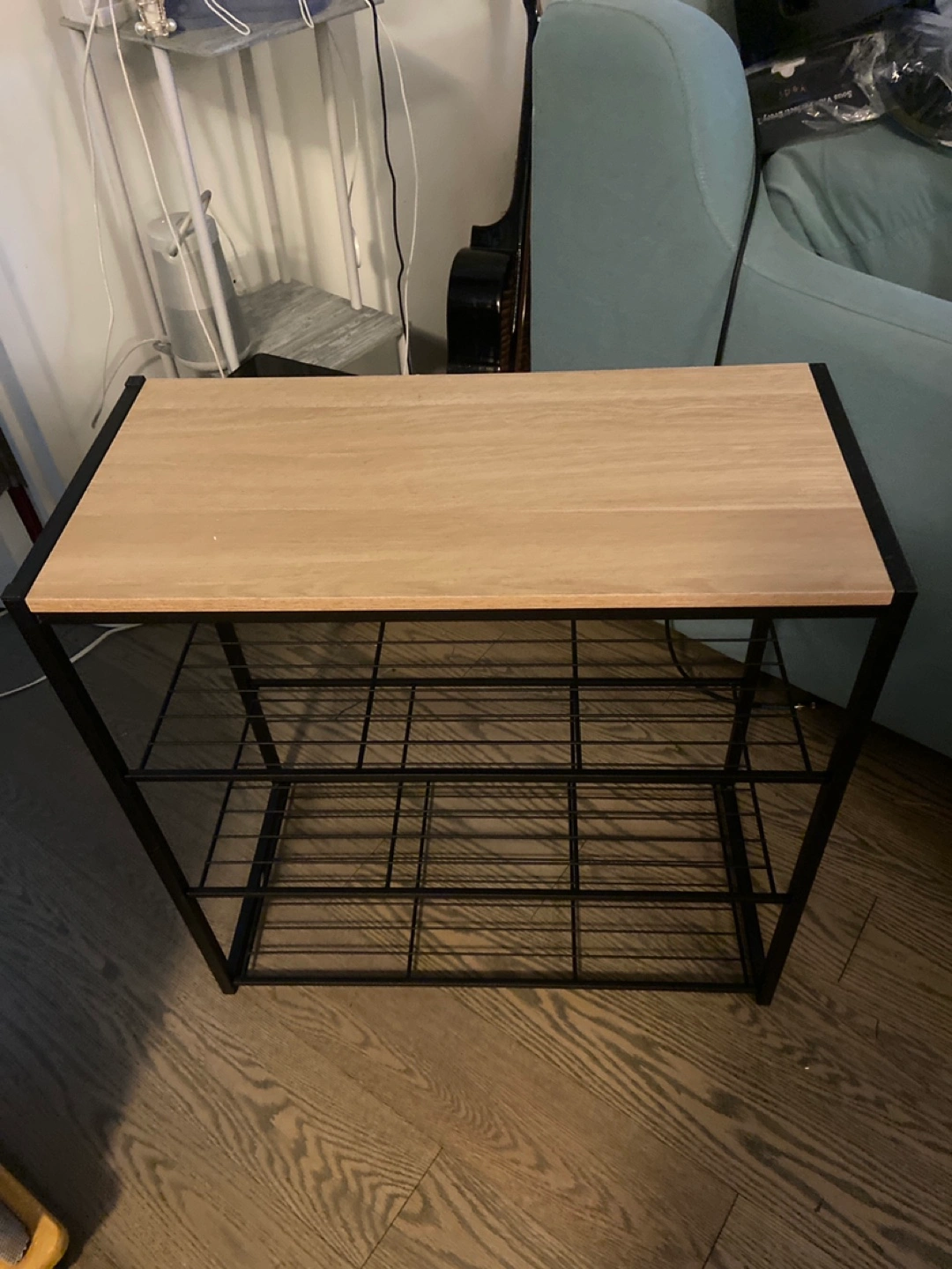 Black metal frame. Light wood top. Three wire shelves. Great for entryway storage.brank spanking new