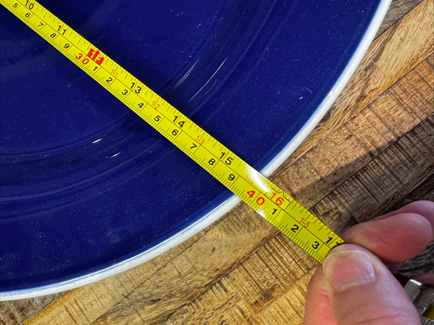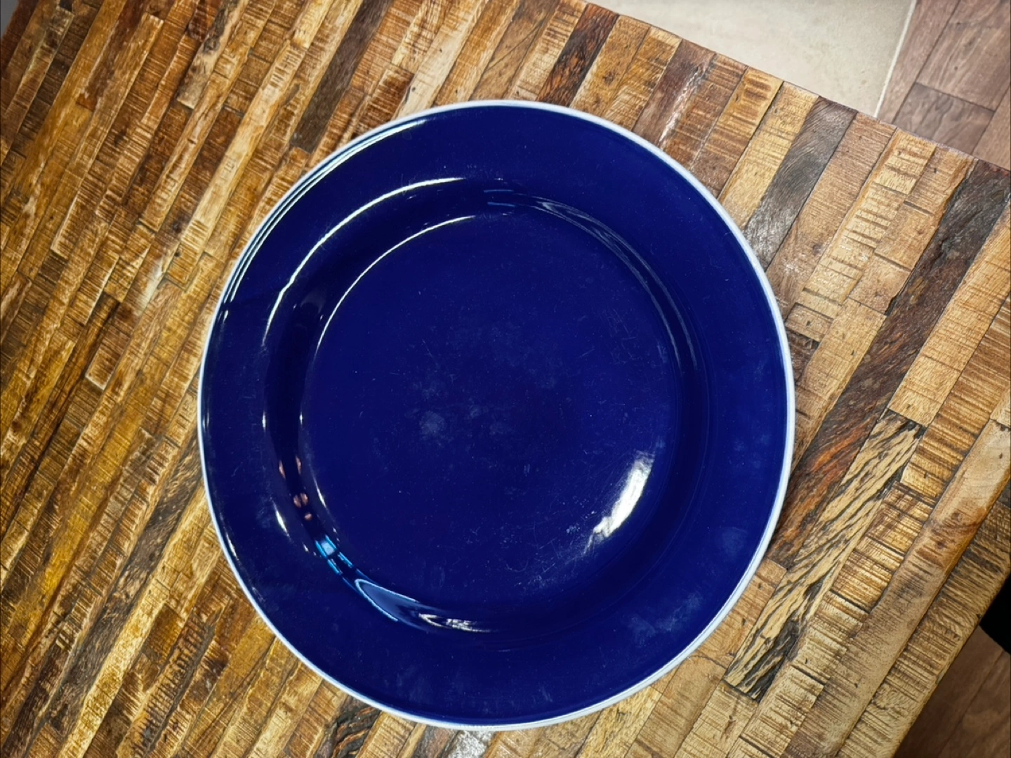 Deep blue ceramic plate. Measures approximately 16 inches in diameter. Slight wear. Perfect for serving pasta or other dishes.