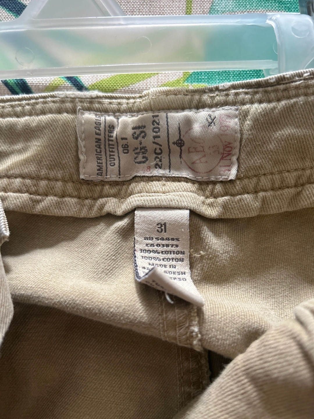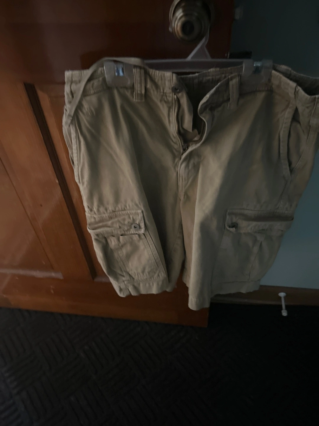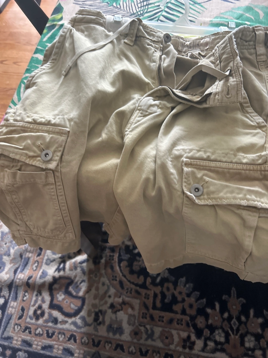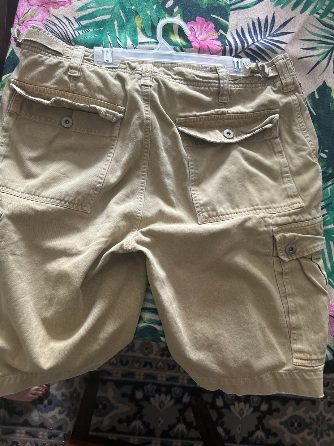 Men's cargo shorts. Size 31. Tan color. Multiple pockets. 100% cotton.