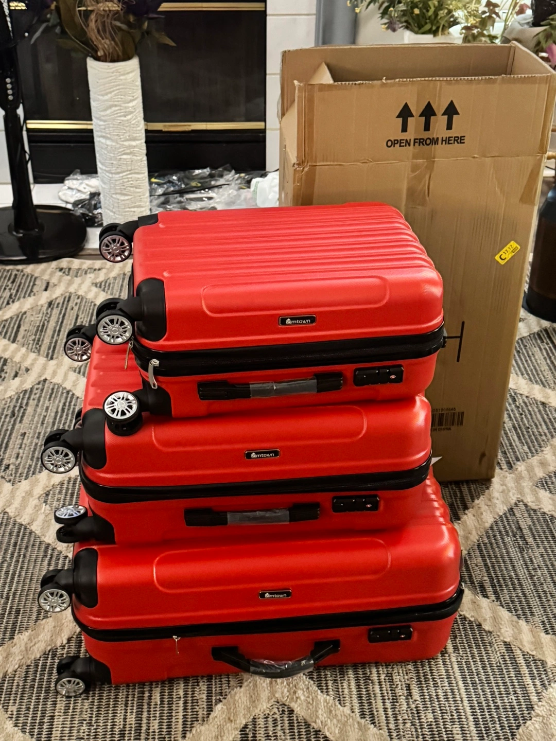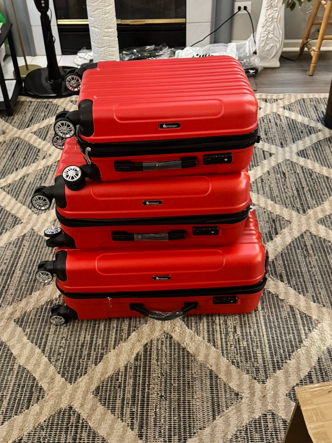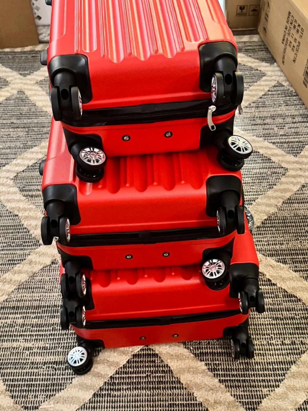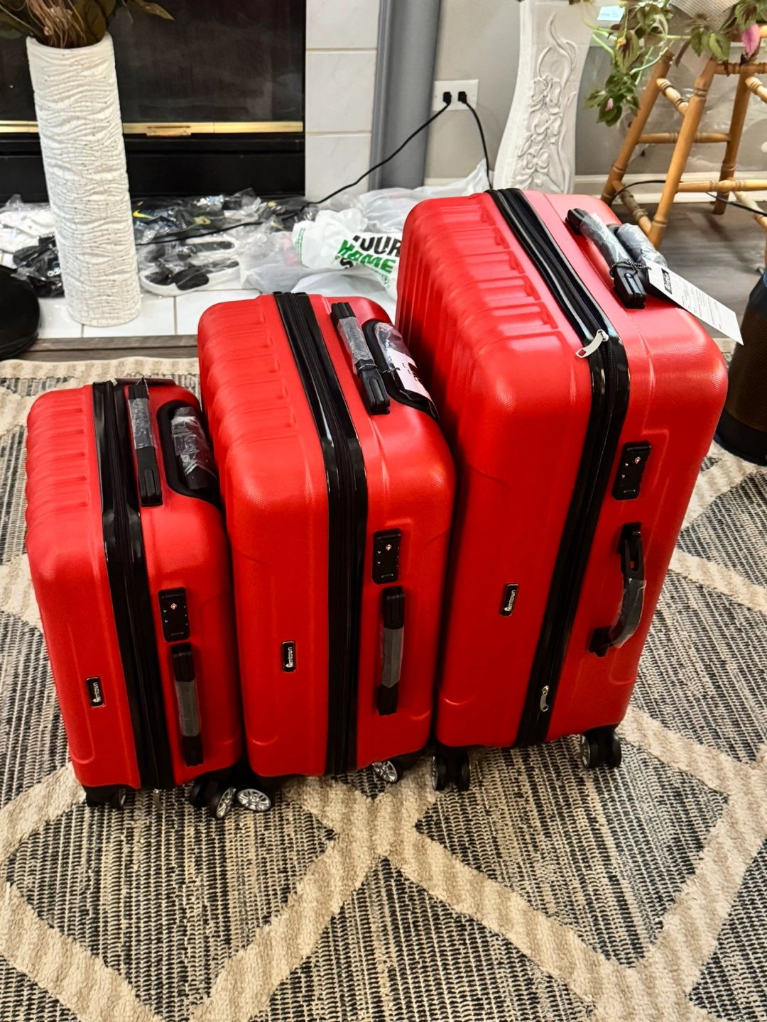 103Brand new, never used. Three-piece set. Red hard shell. Spinner wheels. TSA-approved locks. Perfect for travel. A 3 piece Travel Luggage Set made of hard rugged ABS plastic, with TSA approved combination locks and 4 spinner wheels on each suitcase so that you could walk each one along with you instead of dragging them like in the old style. THEY COME IN ALL AIRLINES AND SEAPORTS APPROVED CHECK IN SIZES OF 28 INCHES 24 INCHES AND A 20 INCH CARRY ON GUARANTEED TO MEET THE NEW 2025 RULES all in a matching Blue color. They come from a virus free, smoke free and pet free home so no odors. Pickup is by Schaumburg and Barrington Road in Schaumburg IL 60194.