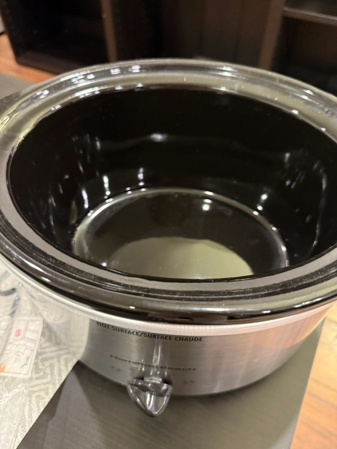 Stainless steel slow cooker. Features a removable ceramic pot. Includes lid and power cord. Good for making stews and other slow-cooked meals.