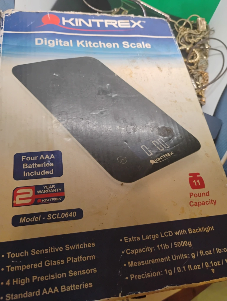 Digital kitchen scale. 11-pound capacity. Features tempered glass platform, touch sensitive switches, and high precision sensors. Includes four AAA batteries. Extra-large LCD with backlight.