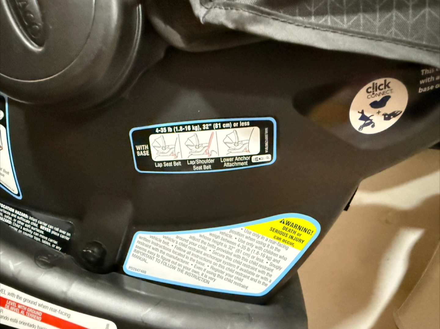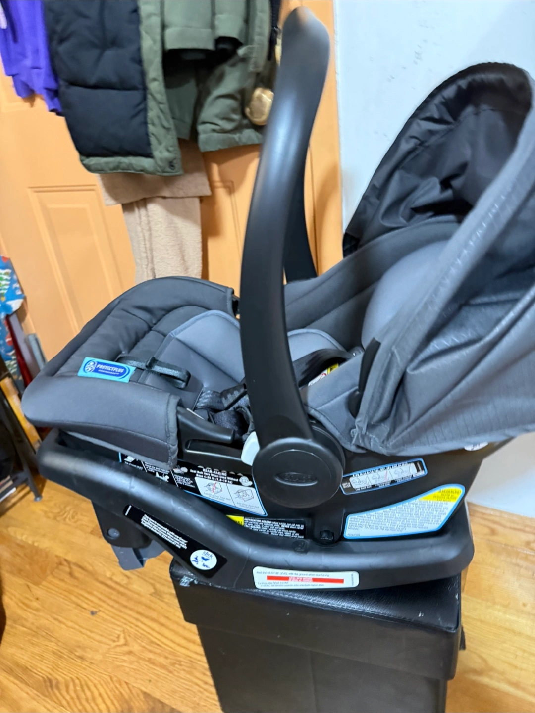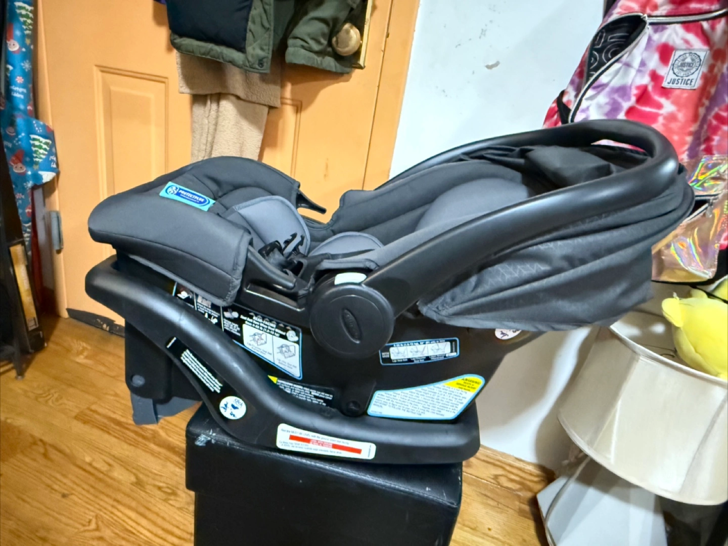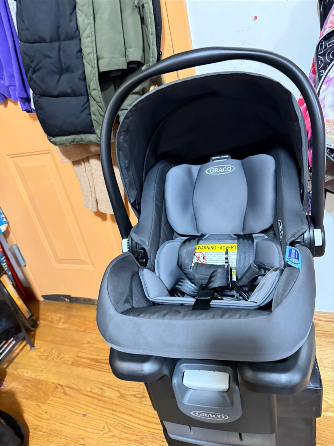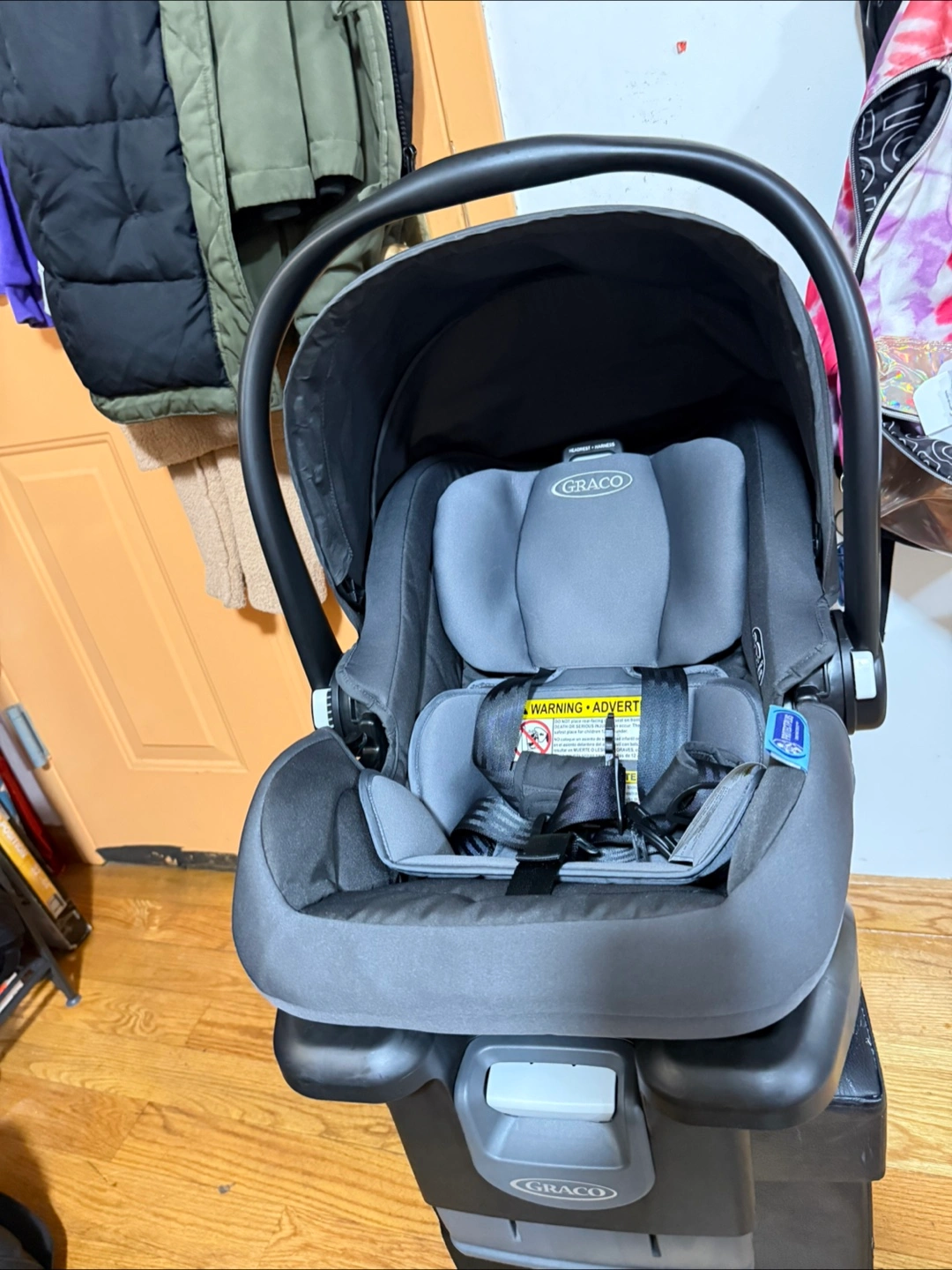 Infant car seat, gray fabric. Includes base. Good condition. Ready for your little one.