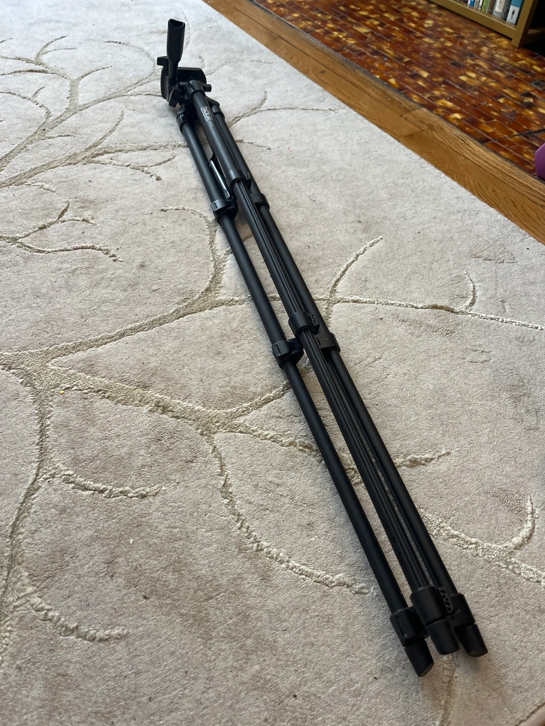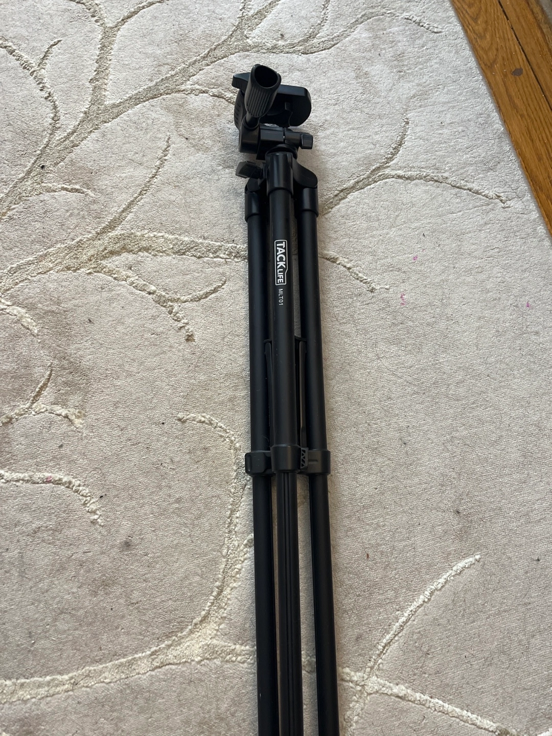 Adjustable height; up to 55”. Phone or camera mount included. Good condition.