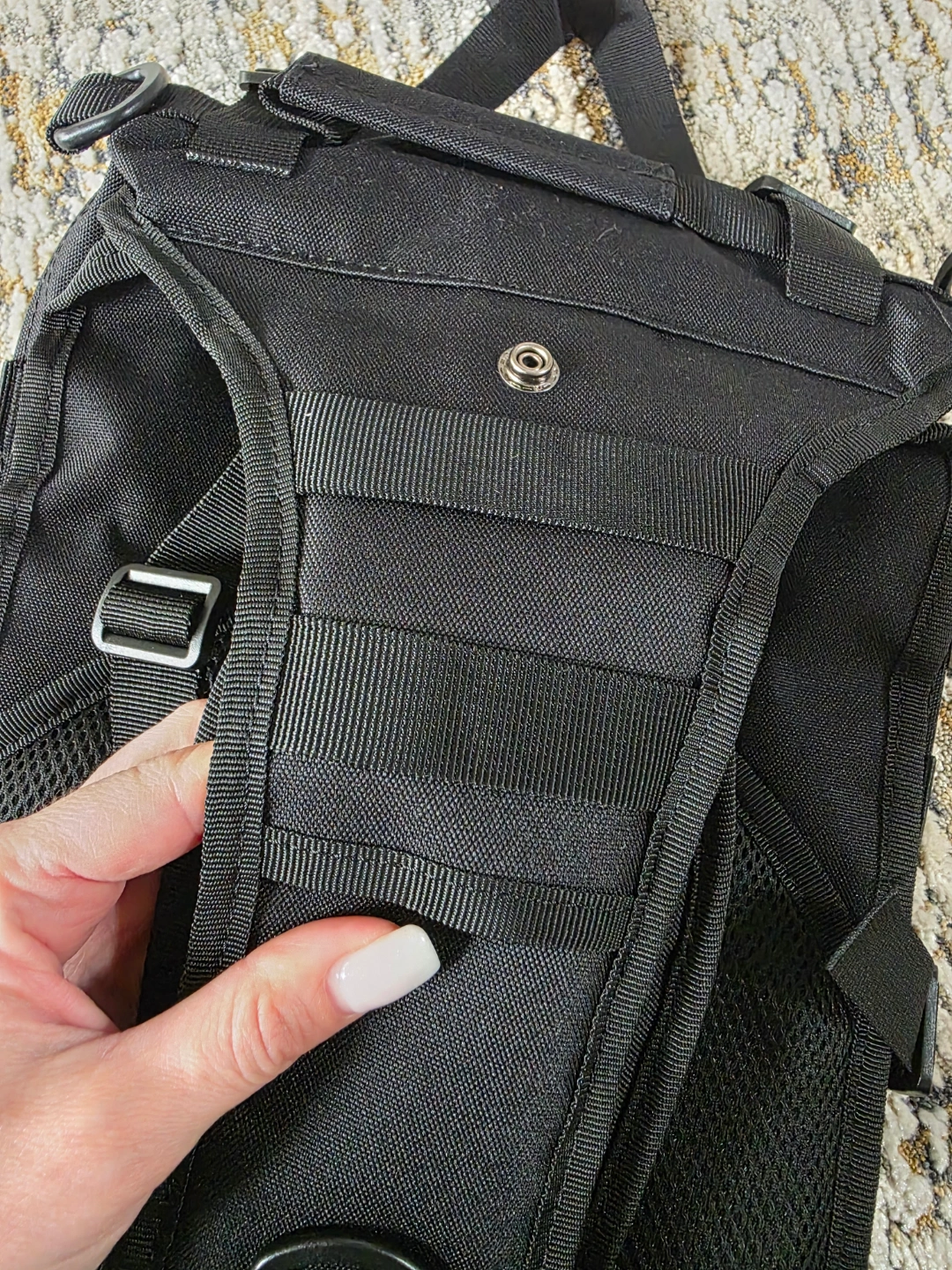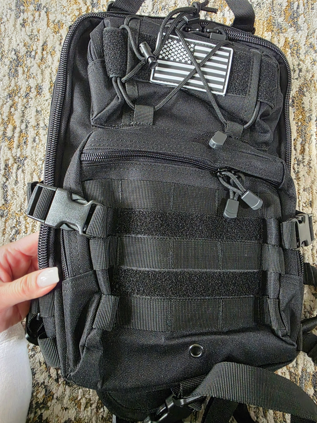 Small tactical backpack. Multiple zippered compartments. MOLLE webbing. Adjustable straps. American flag patch.