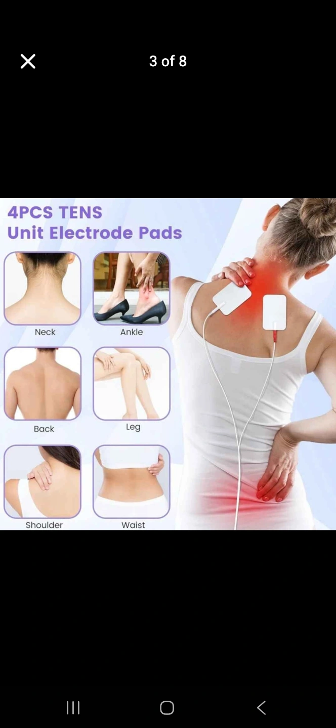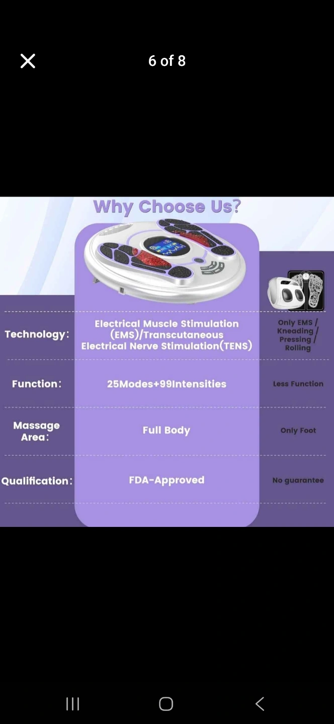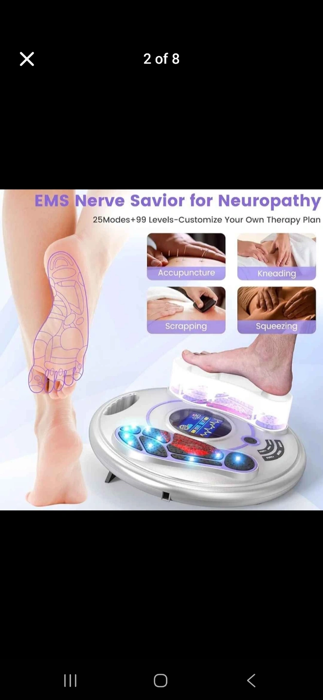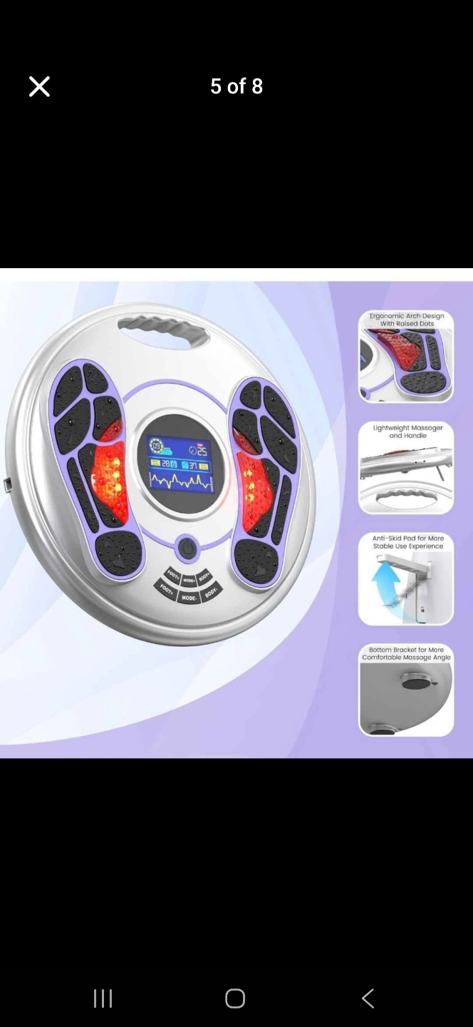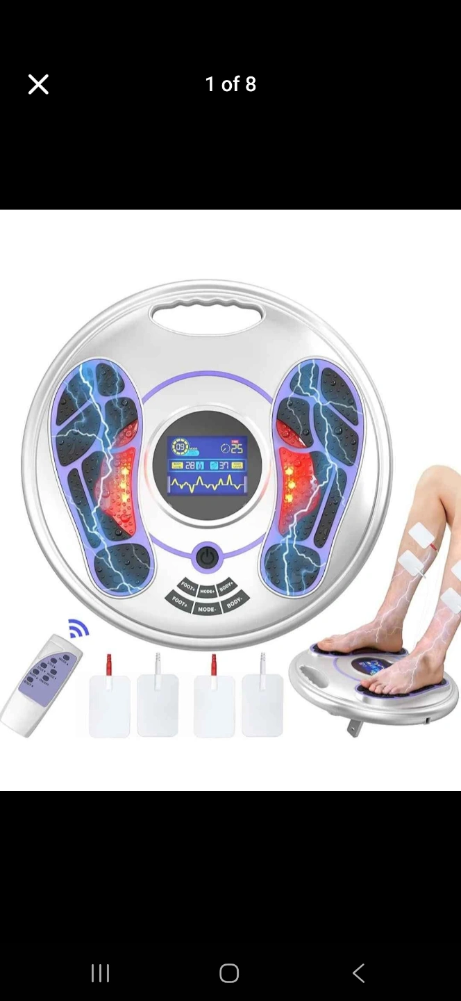 Foot massager with 25 modes and 99 levels. Includes 4 TENS unit electrode pads for neck, back, shoulder, leg, ankle, and waist. Lightweight and portable design with ergonomic arch. Features acupuncture, kneading, scraping and squeezing functions.
