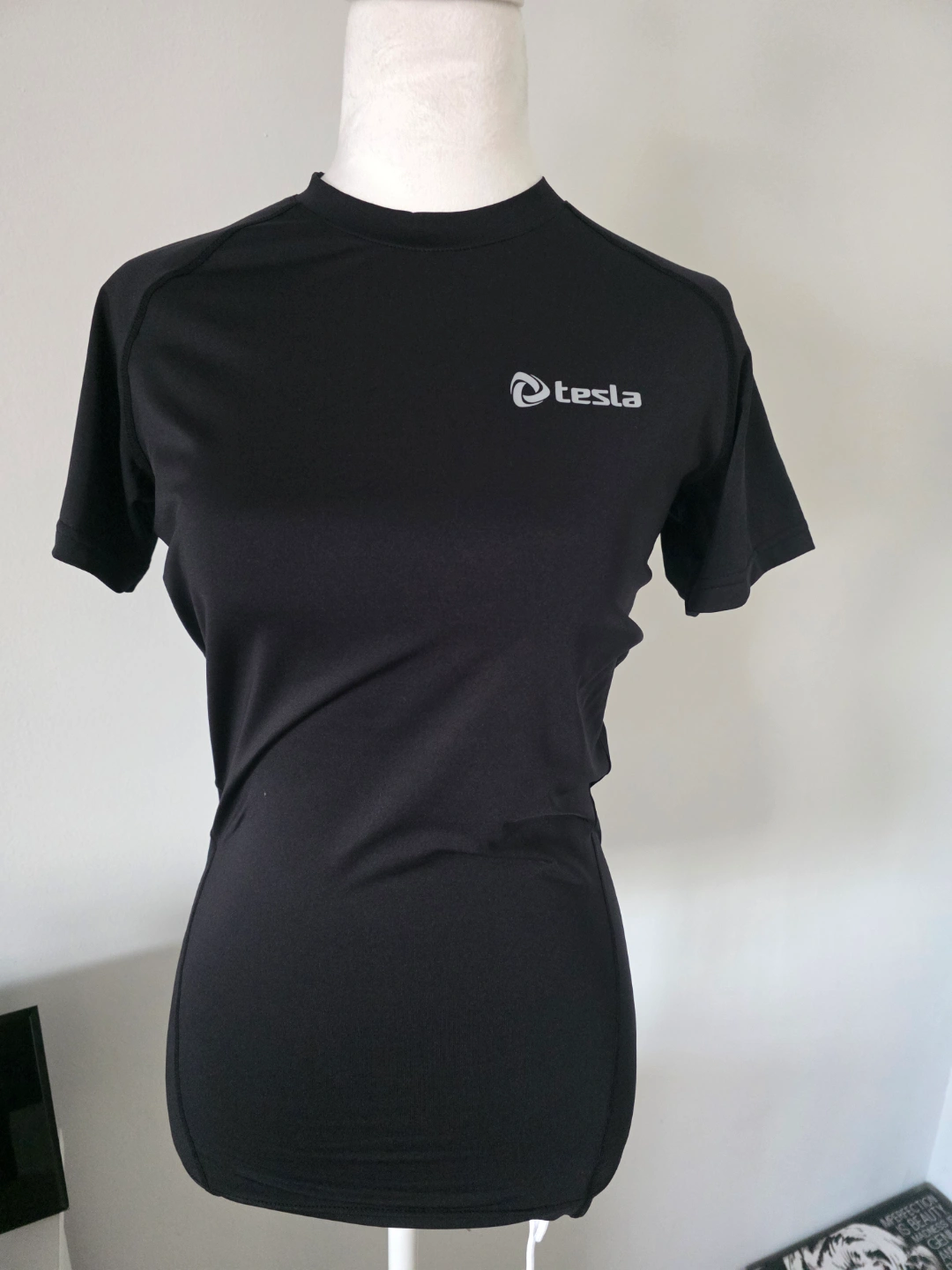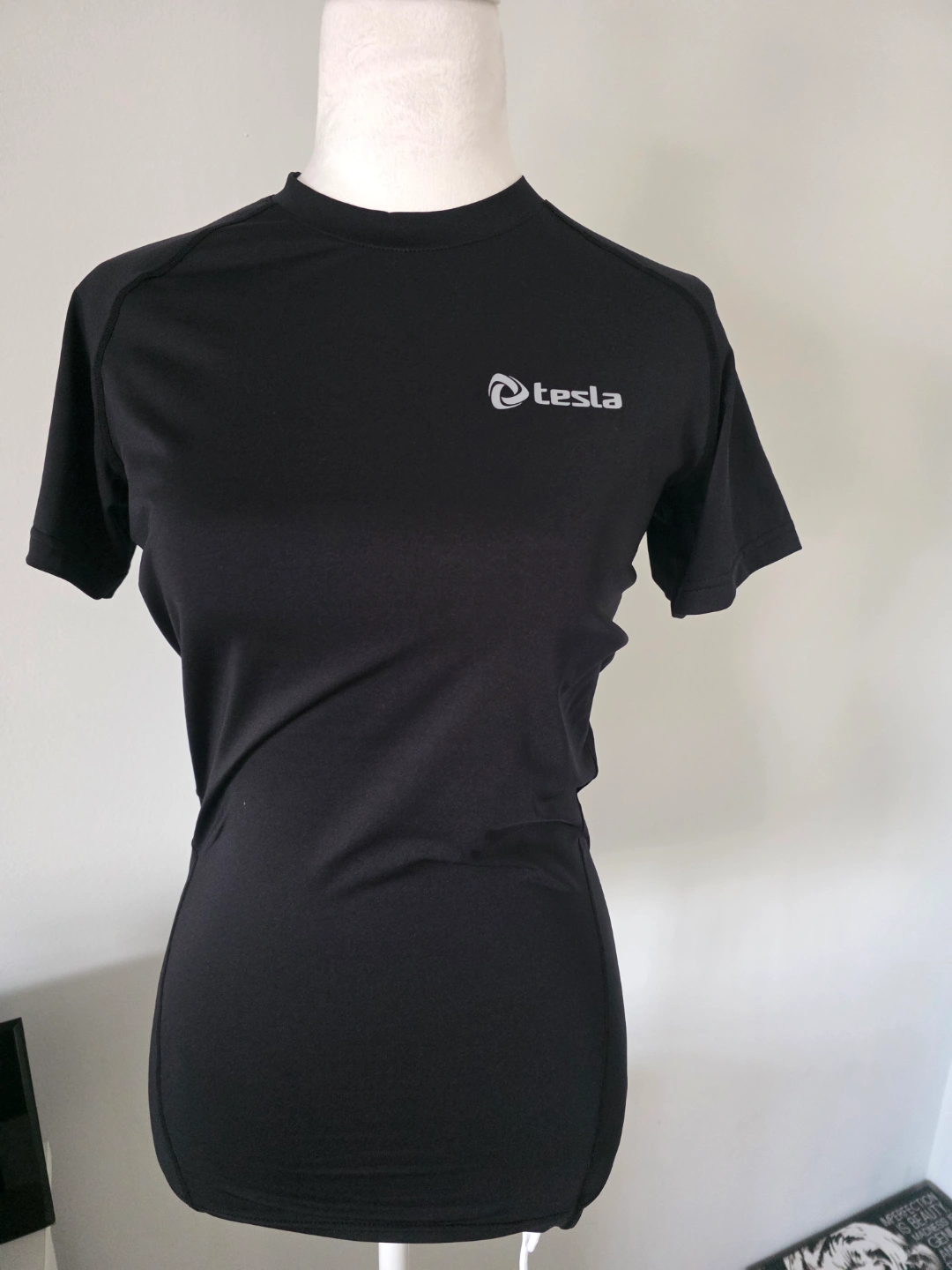 Short sleeve, black athletic shirt. Moisture-wicking fabric. Great for workouts or casual wear. Small logo on chest.