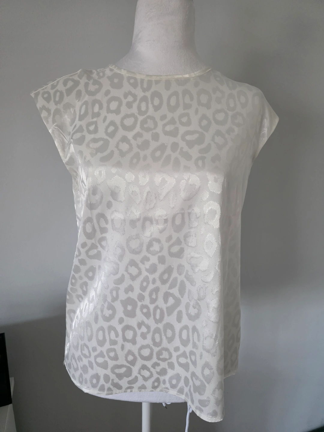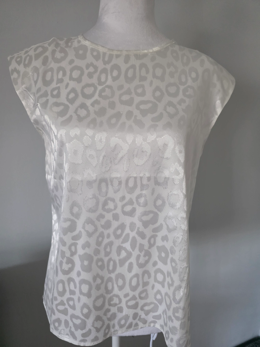 Cream-colored satin top. Leopard print. Short sleeves. Relaxed fit. Slight drawstring at the bottom.