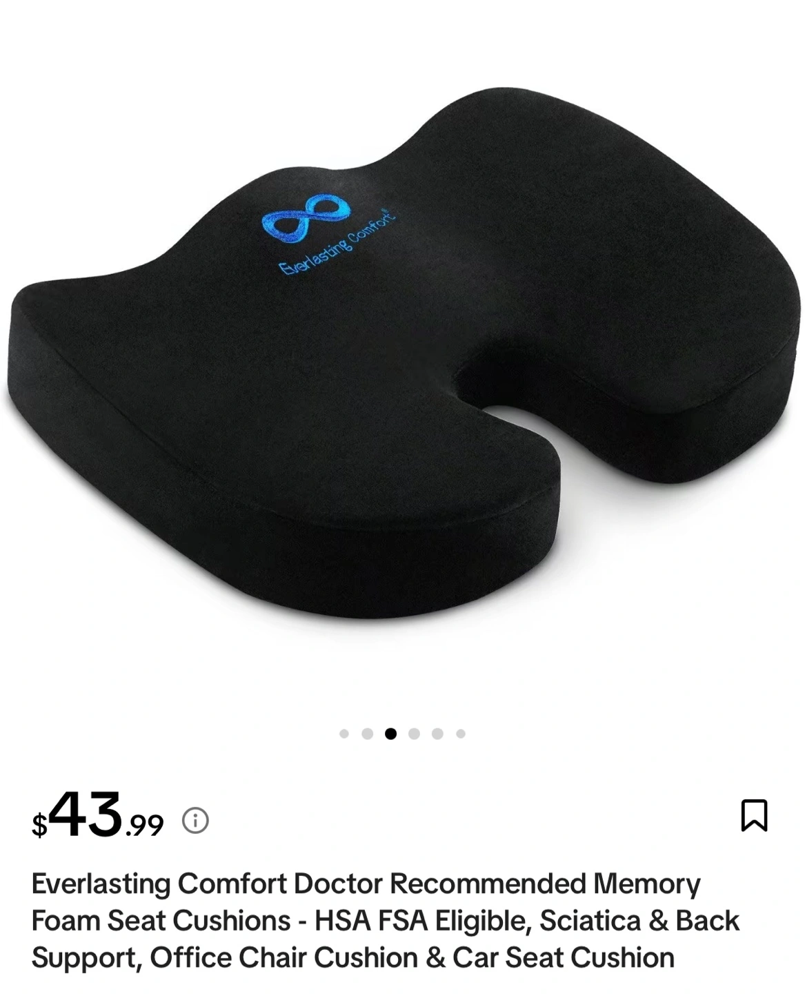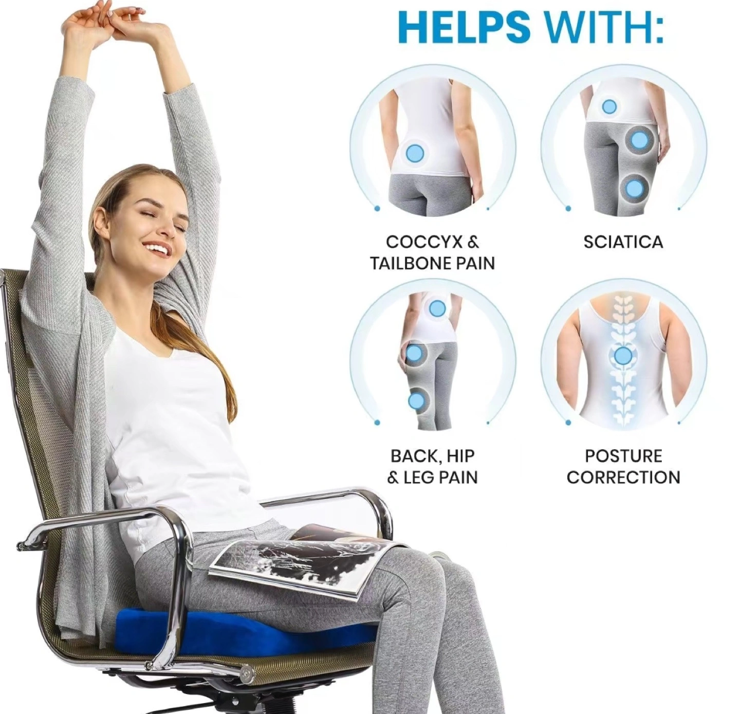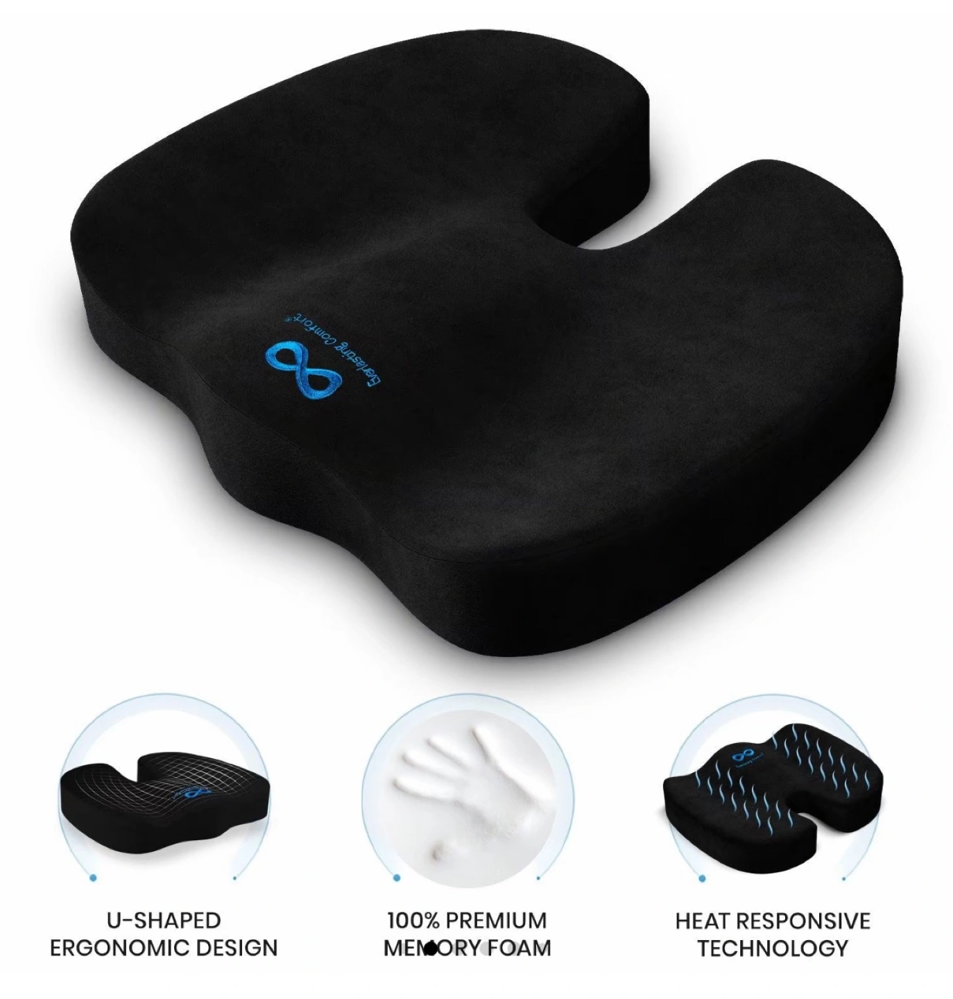 U-shaped ergonomic design. Memory foam. Heat responsive technology. Helps with sciatica, coccyx & tailbone pain, back, hip & leg pain, and posture correction. Office chair cushion & car seat cushion. FSA eligible.