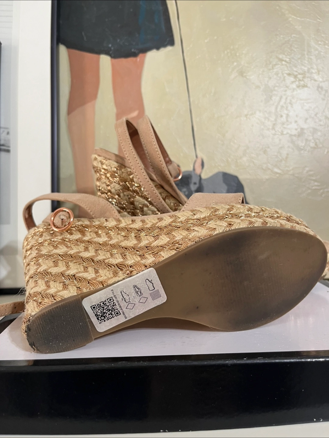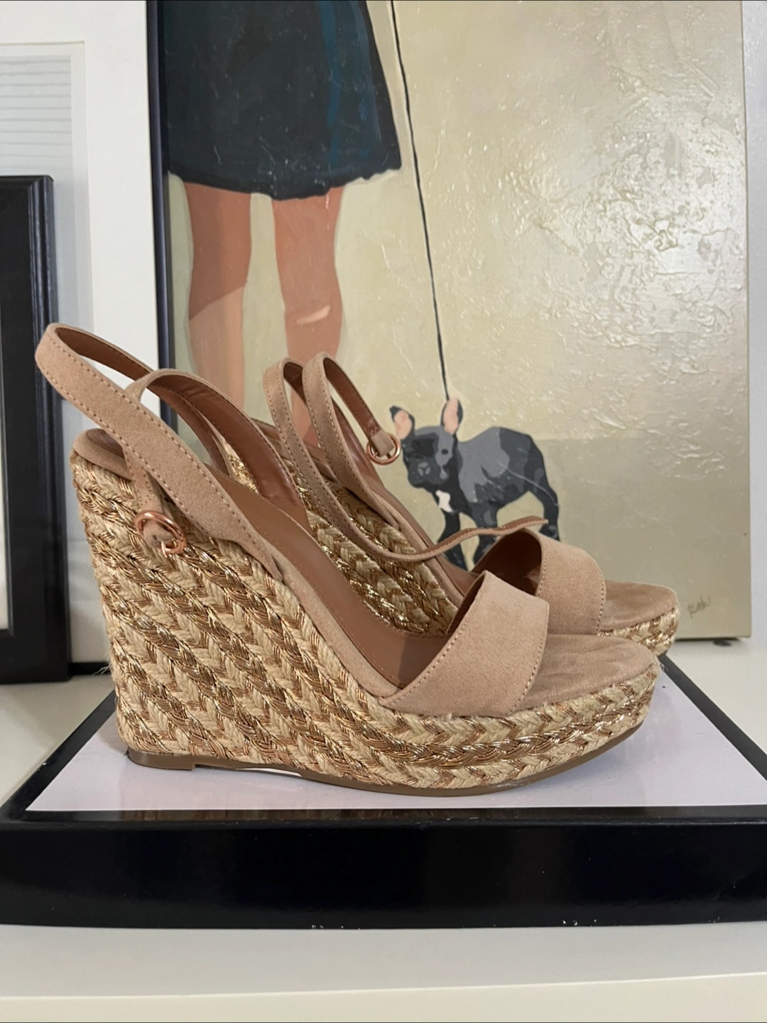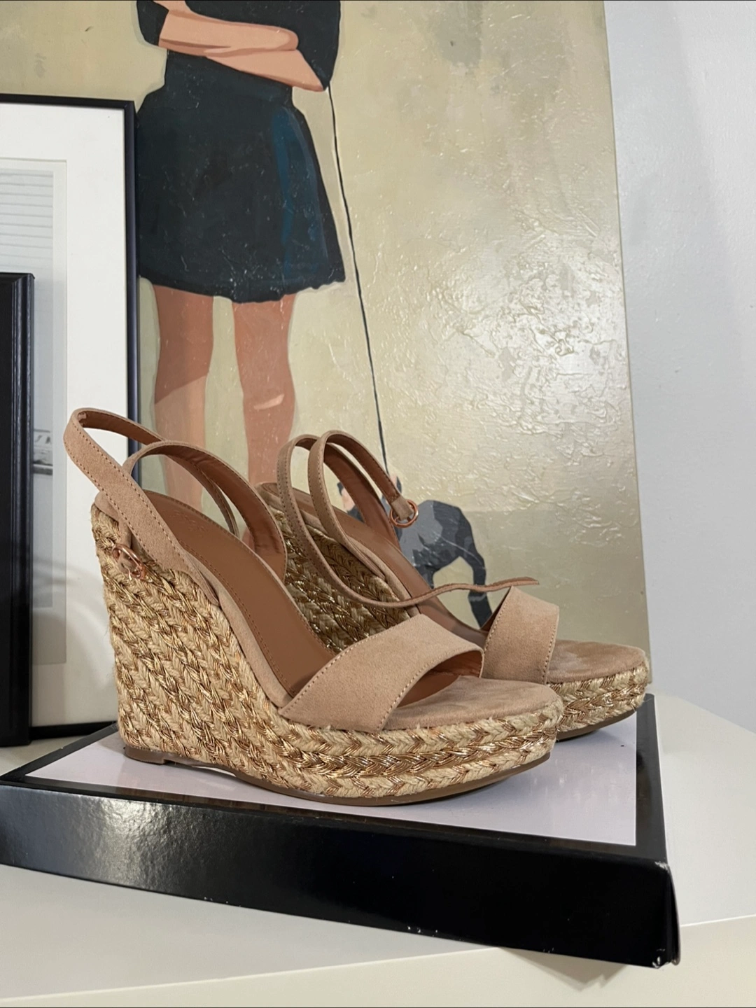 Women's beige suede and woven wedge sandals. Ankle strap closure. Slight heel wear (worn only once). Size 8.
