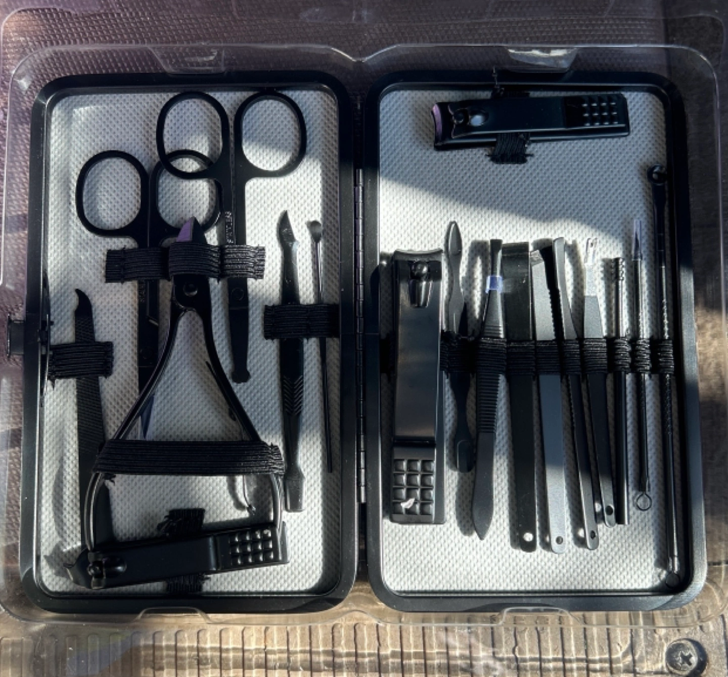 226Complete set of nail care tools. Includes clippers, scissors, tweezers, files, and more. All tools are black and stored in a hard plastic case.