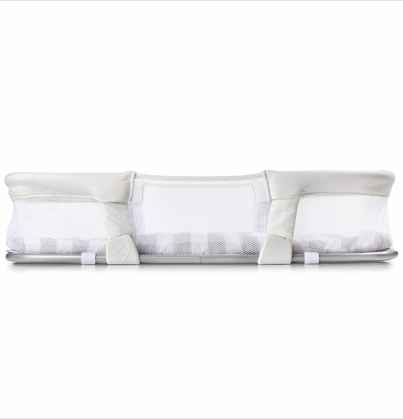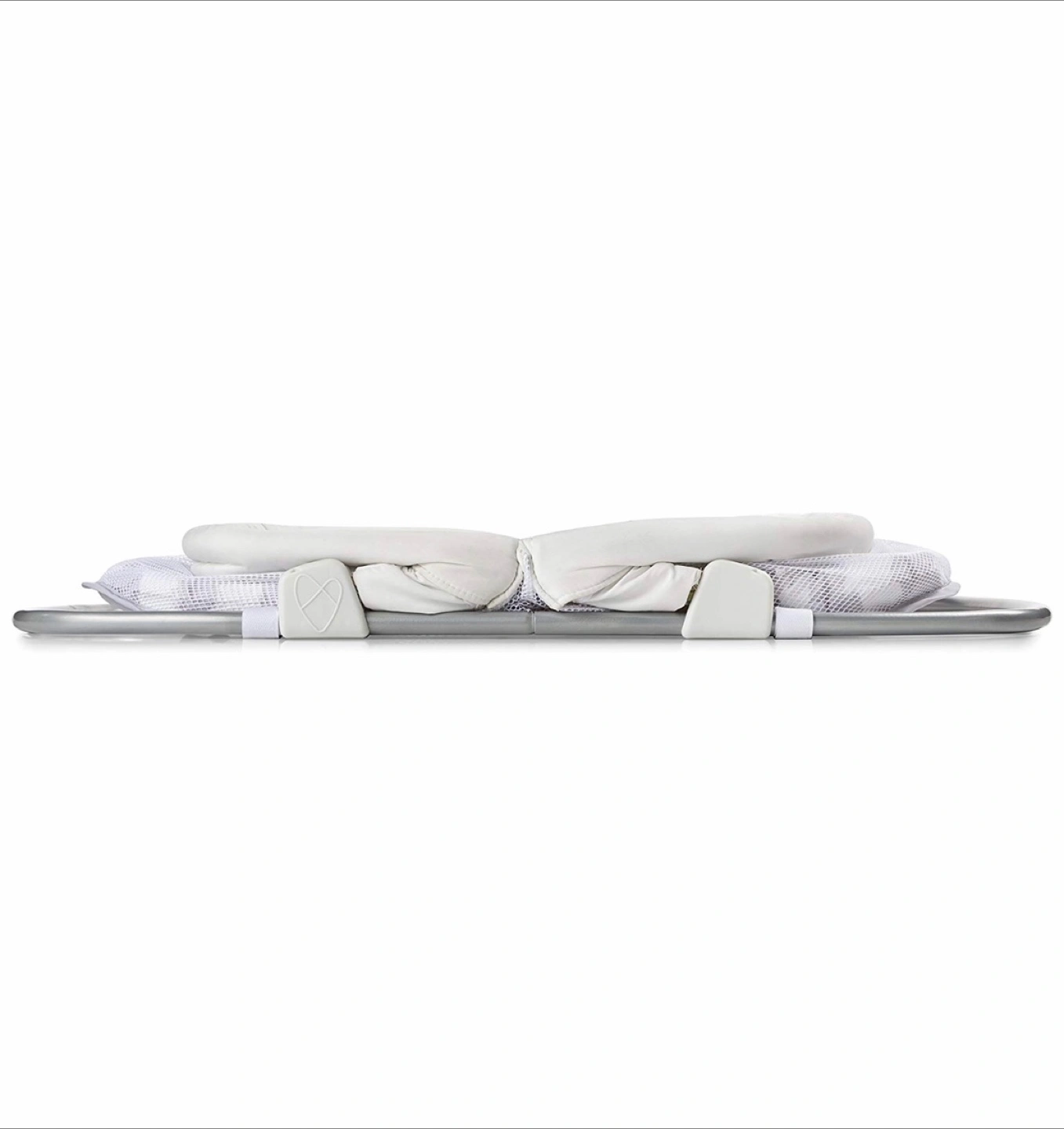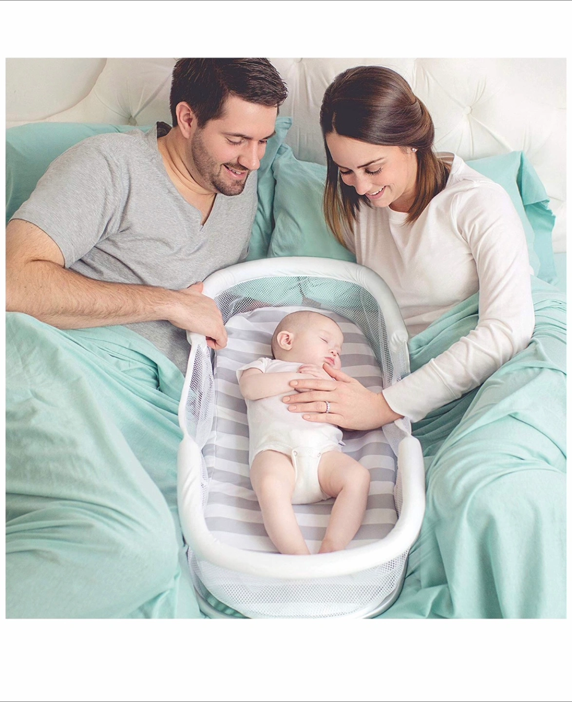New baby bassinet. Features a breathable mesh design. Gray and white striped mattress included. Easy to fold for storage.