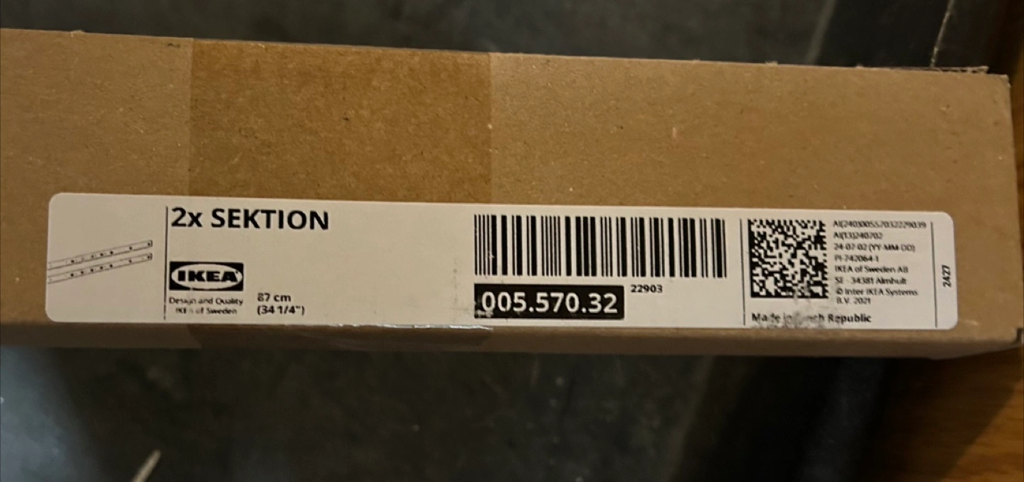 161Two new IKEA SEKTION Connector rail for cabinet/cover pnl, 34 1/4" Or 67 cm long. Pine wood. Pre-drilled holes. This rail helps you to connect your base cabinets back-to-back. It can also be used to attach a cover panel to the back side of a base cabinet, giving your kitchen island or peninsula a uniform look. Part number 005.570.32 normally $12