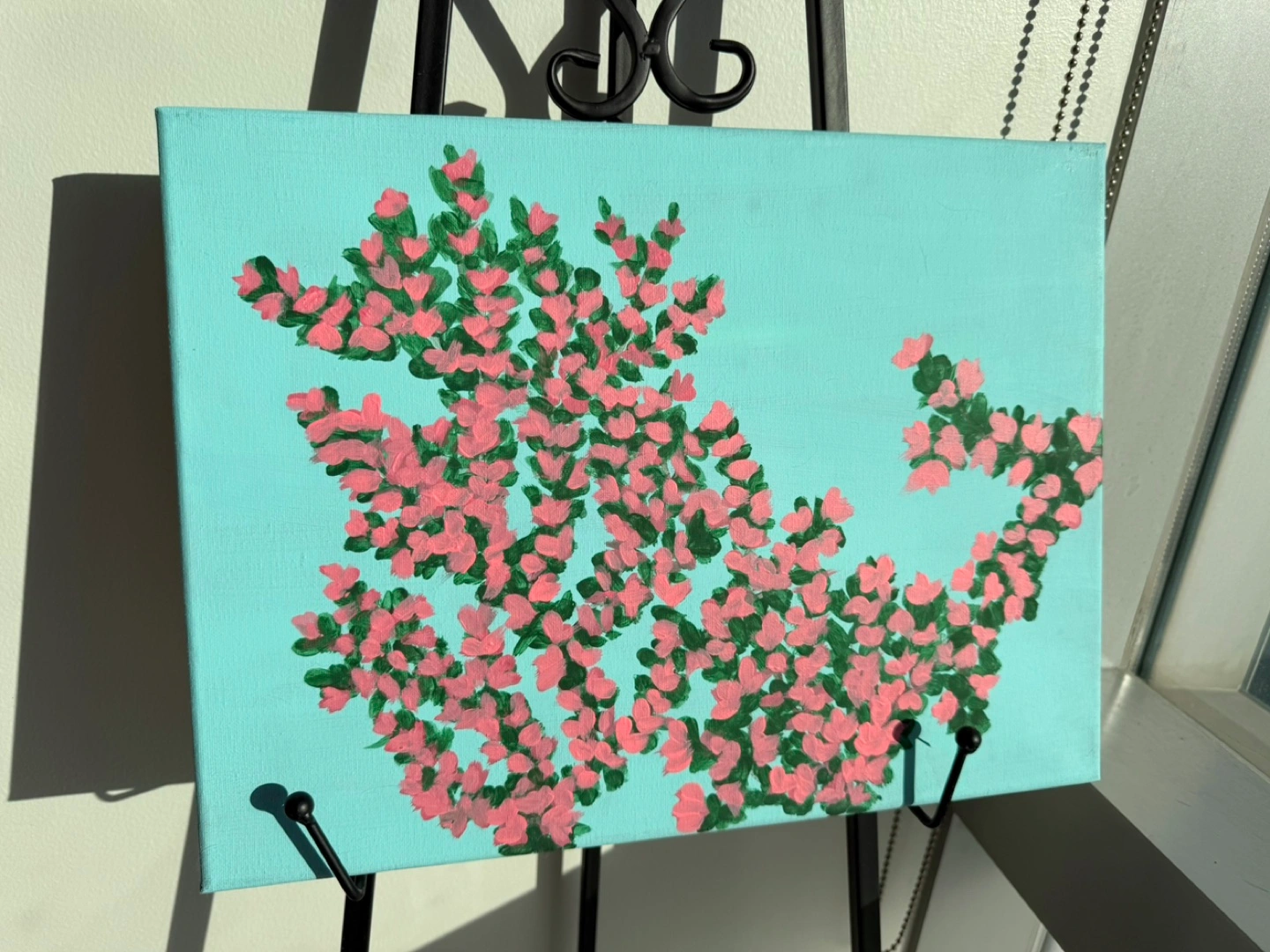Hand-painted canvas. Pink flowers on a light teal background. Small, textured brushstrokes. Ready to hang.