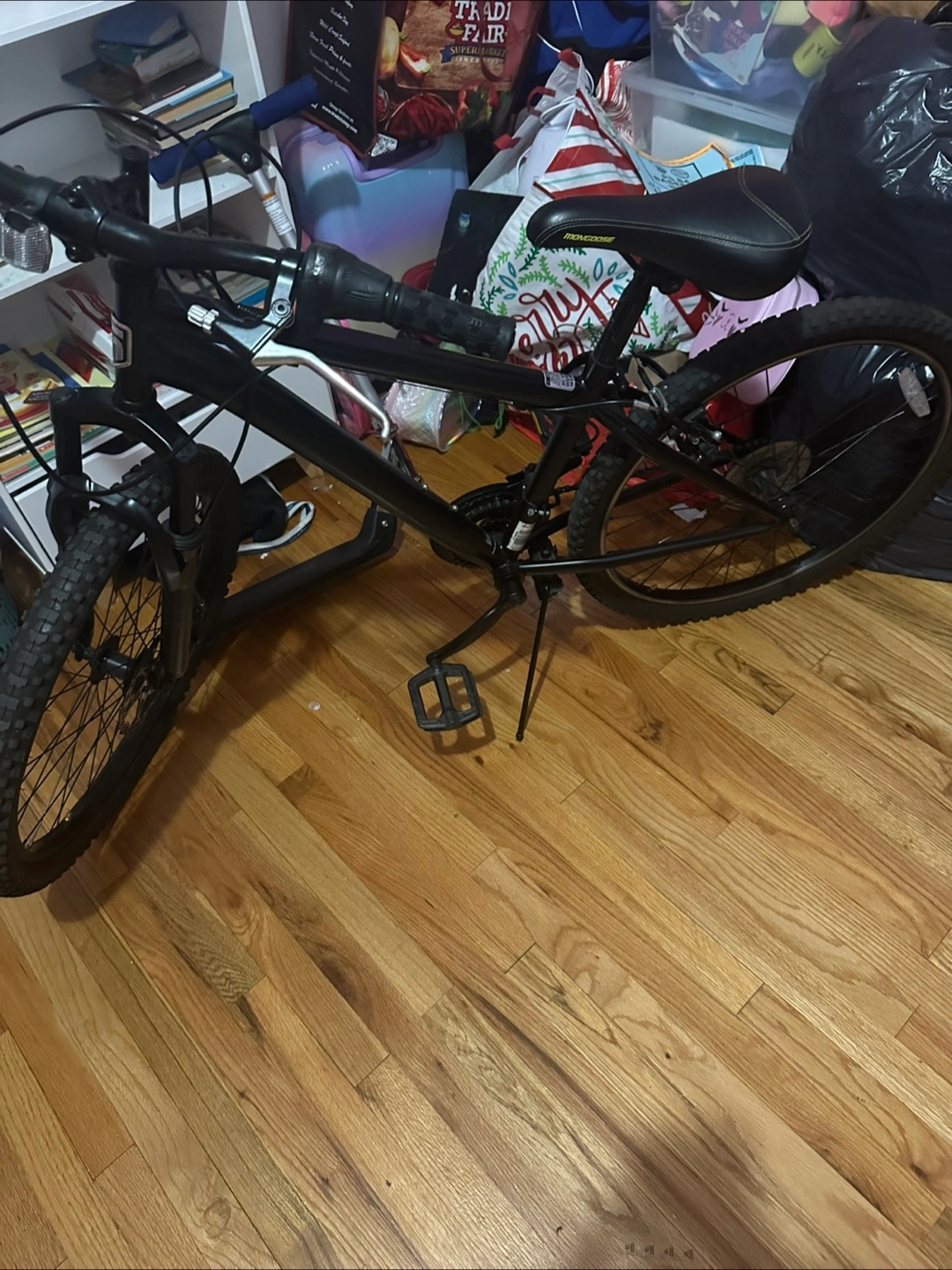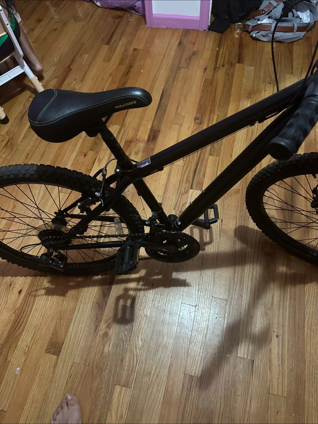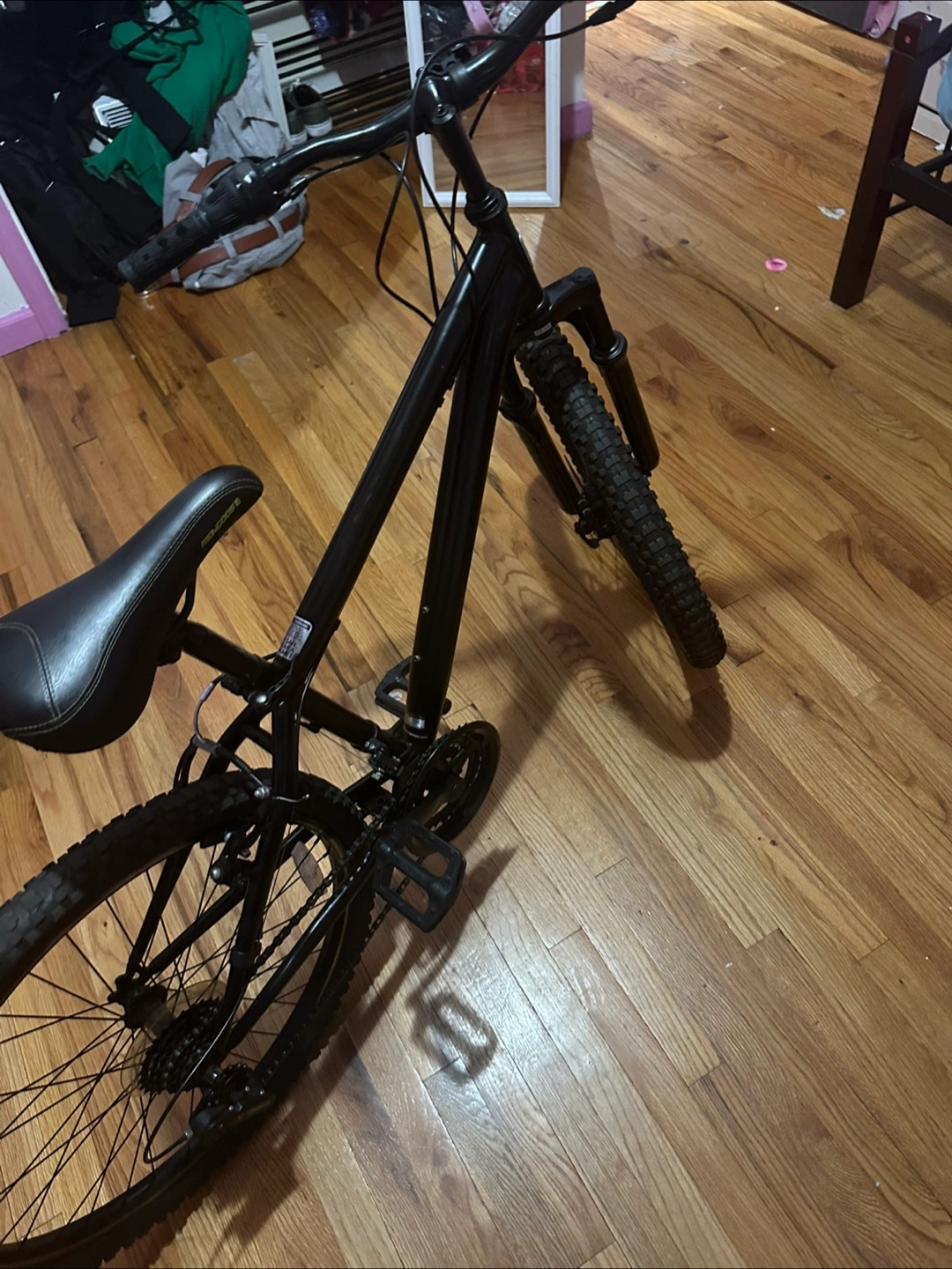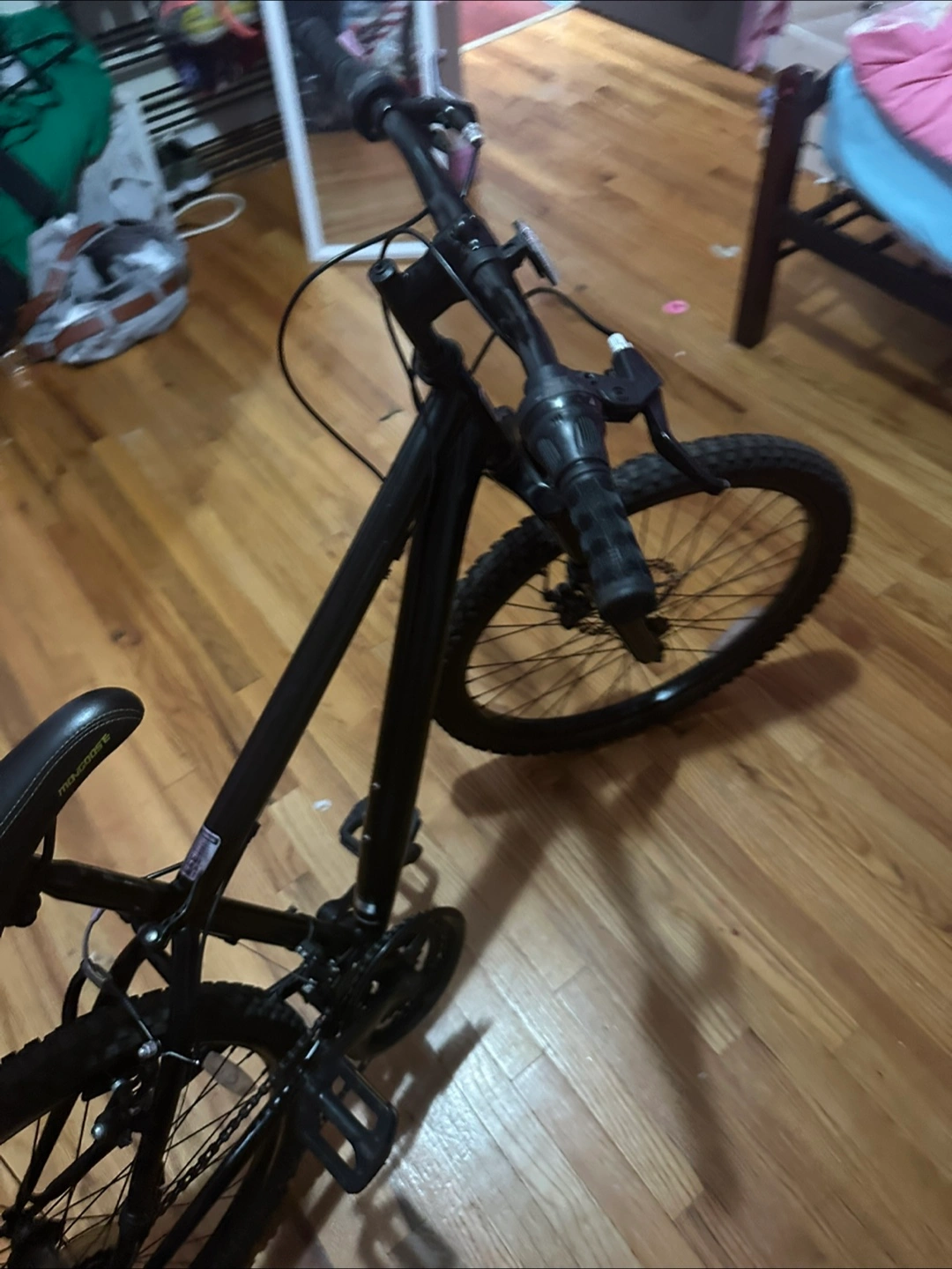 Black mountain bike. 26 inch wheels. Good condition. Needs a little cleaning in the back tire needs a new tubing has a flat, but the bike is very well. It makes good for a starter bike. The handles a little worn out you can change that if you like, but other than that, the bike is good brakes work everything works.