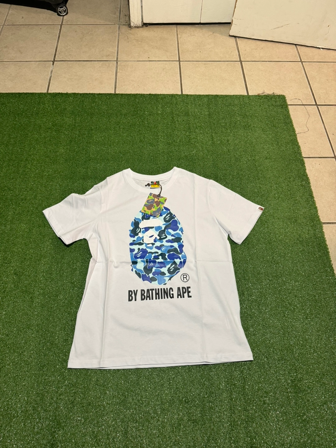 150White short sleeve tee. Features a large blue camo Bape head logo on the front. Brand new with tags. Men's.