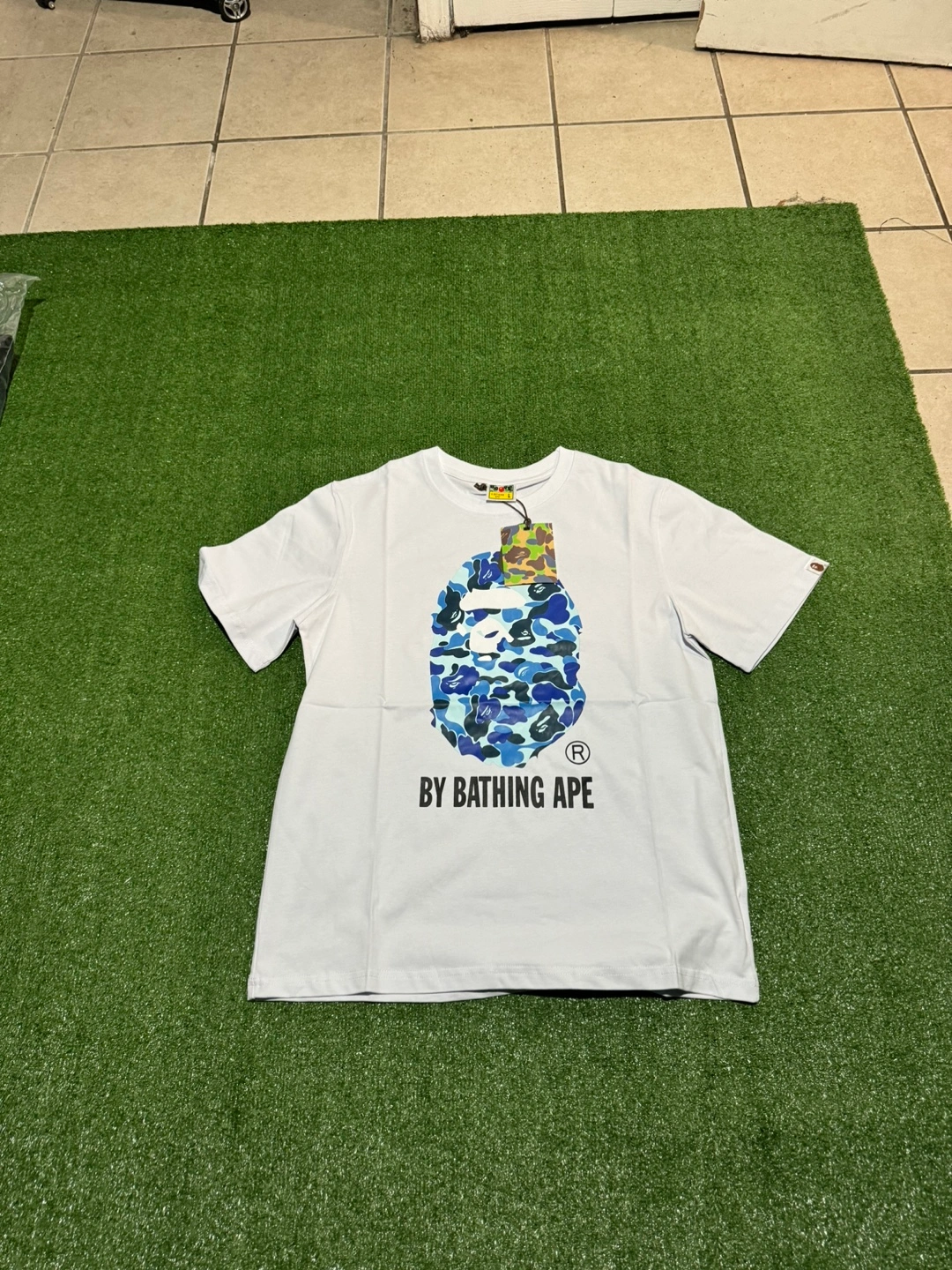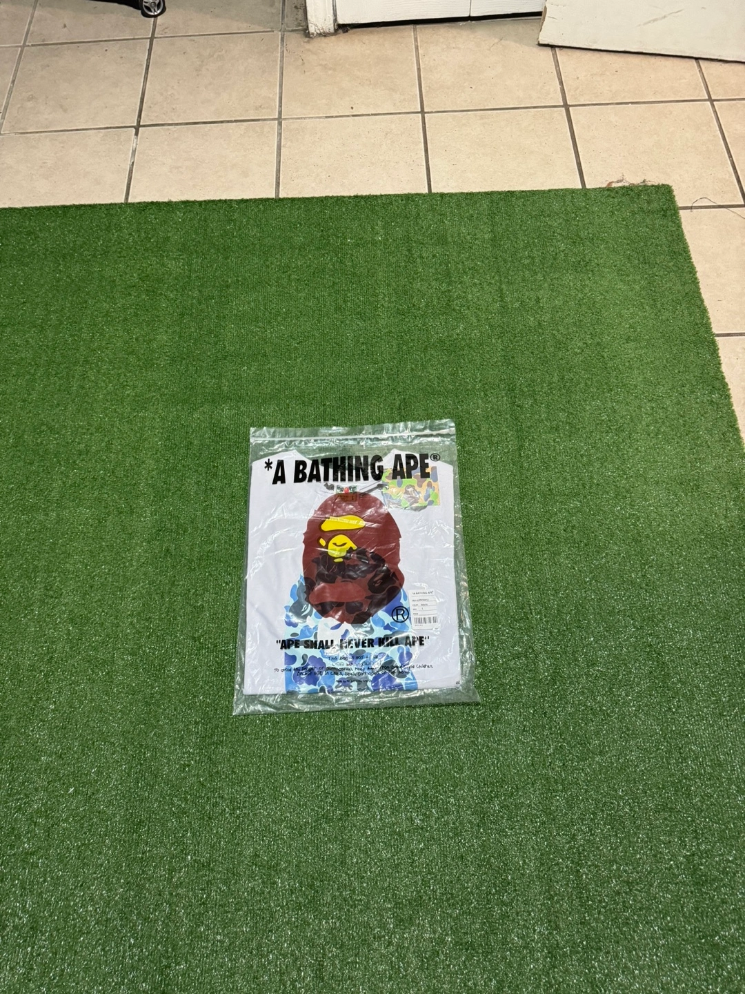 134Brand new with tag. Short sleeve t-shirt. Features a large blue camo ape head graphic on the front. Size small.