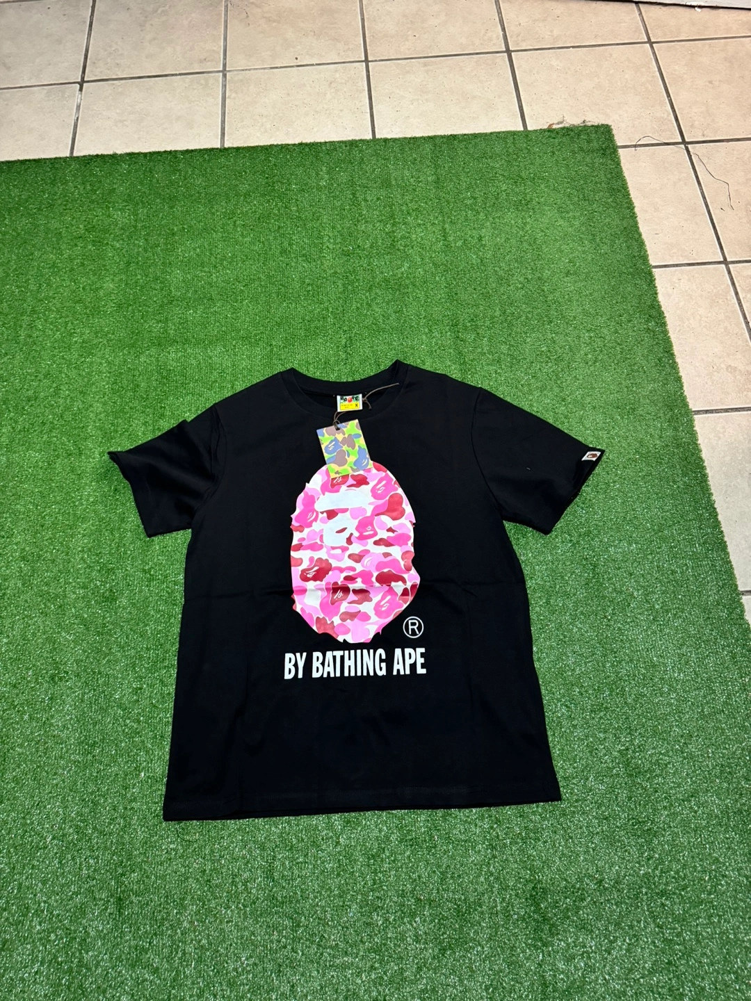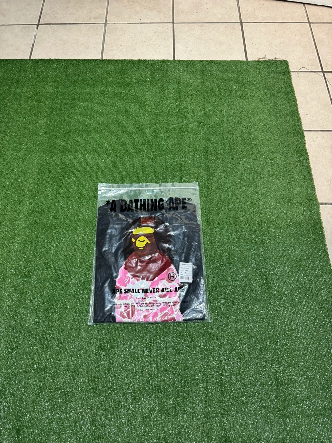 139Black T-shirt. Pink camo Baby Milo graphic. Short sleeves. Crew neck. New with tags. A Bathing Ape branding.
