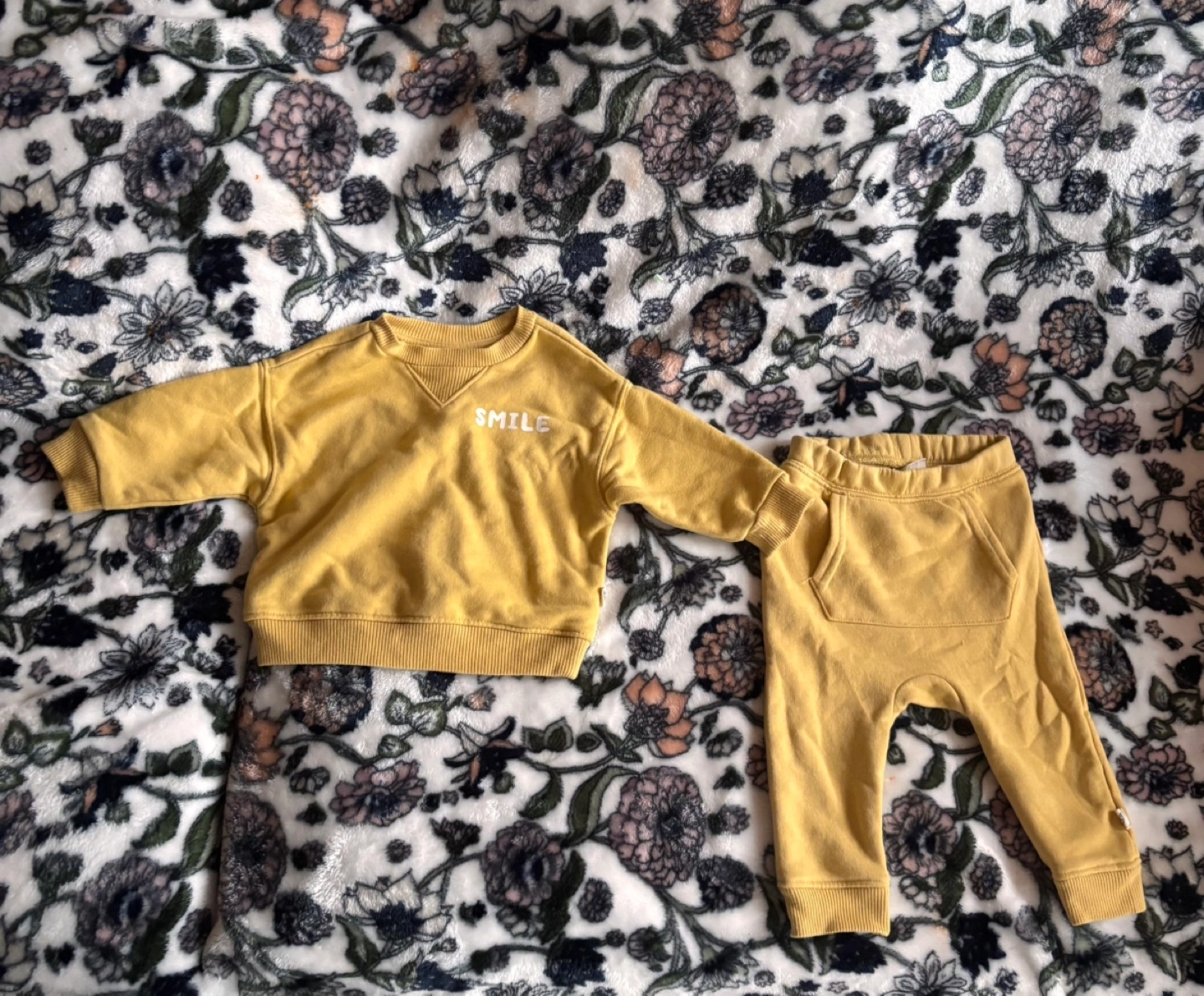 1000+Adorable unisex outfit. Mustard yellow sweatshirt with a small 'Smile' graphic. Matching joggers with pockets. Soft material. Perfect for fall.