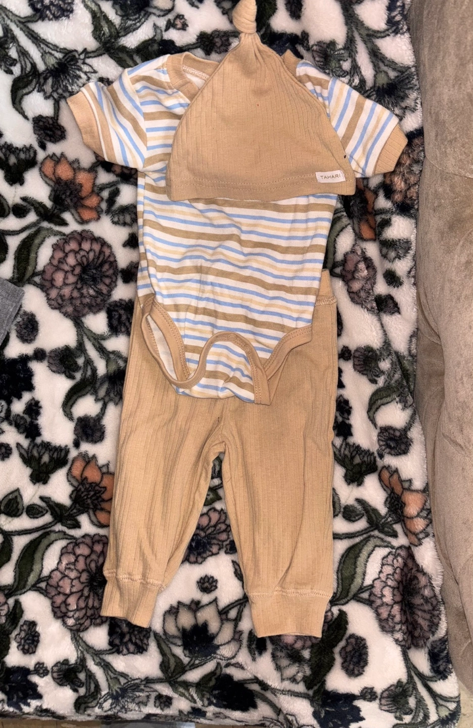 1000+Adorable newborn outfit. Tan ribbed pants, striped bodysuit, and matching hat. Neutral colors. Perfect for a baby shower gift.