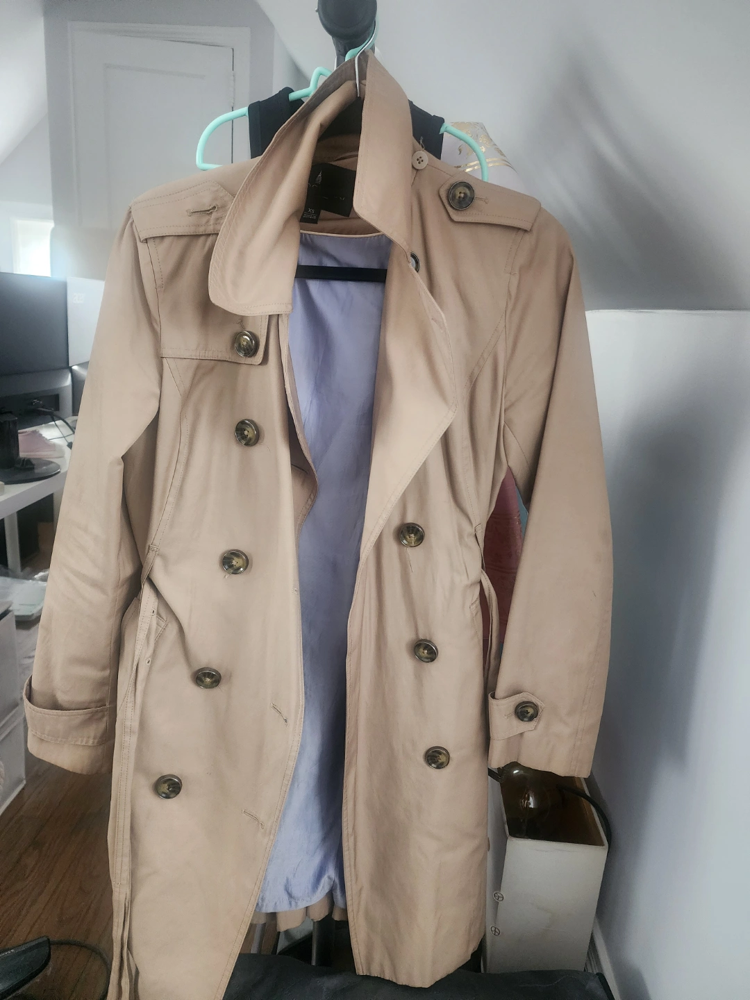 15Classic trench coat. Double-breasted buttons. Beige color. Belted waist. Size XS.