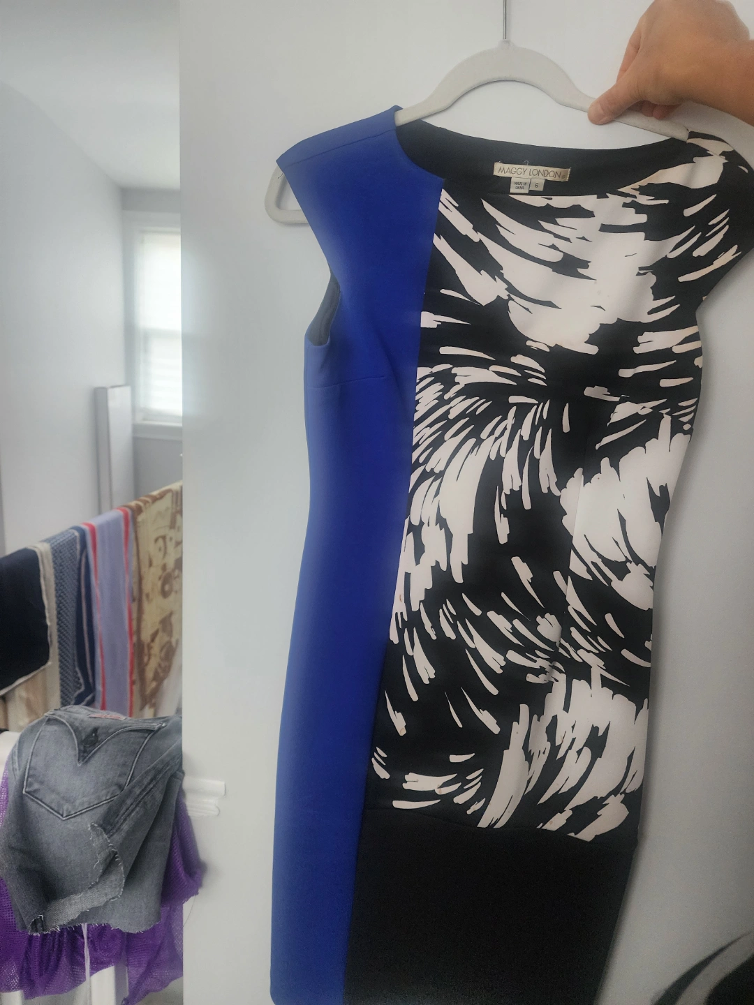15Sleeveless dress. Blue and black abstract print. Size 6.