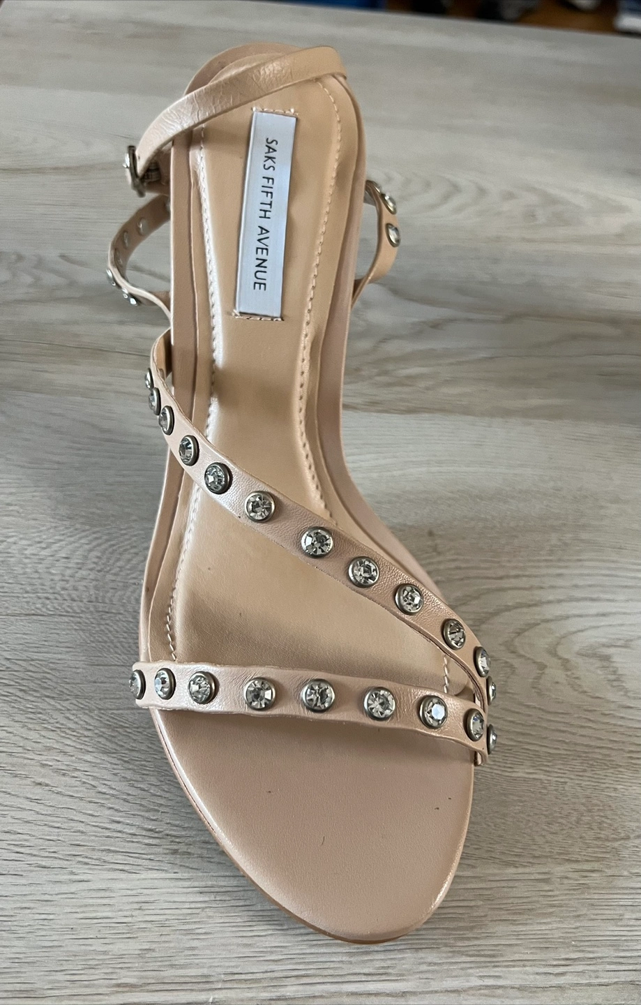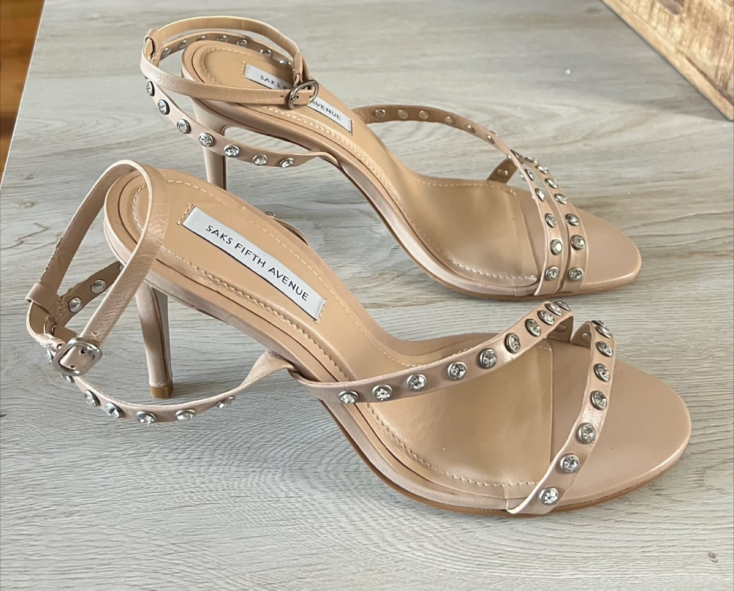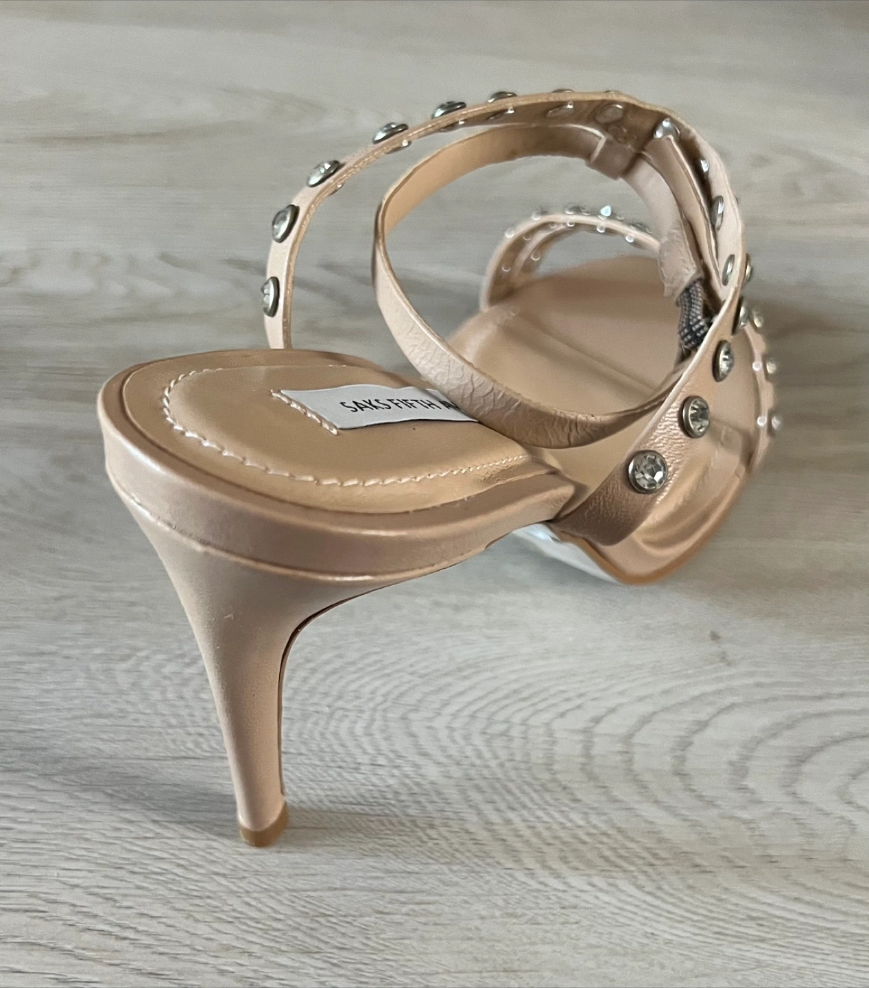Beautiful leather nude-colored heels. Rhinestone embellishments. Ankle strap with buckle closure. Slight heel. Great for parties or special occasions.