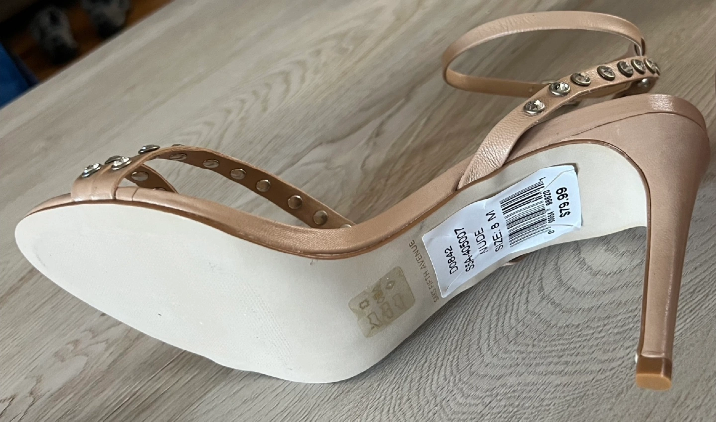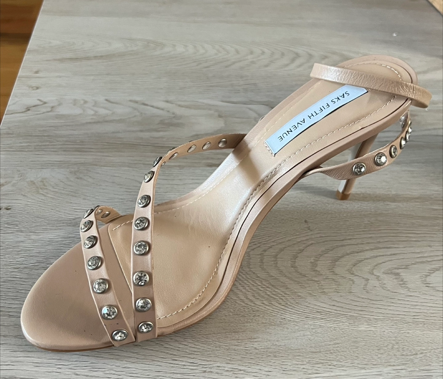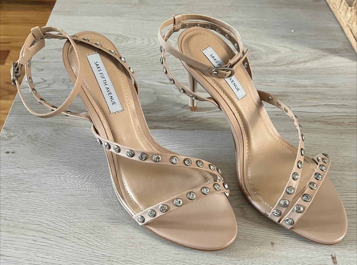 Beautiful leather nude-colored heels. Rhinestone embellishments. Ankle strap with buckle closure. Slight heel. Great for parties or special occasions.