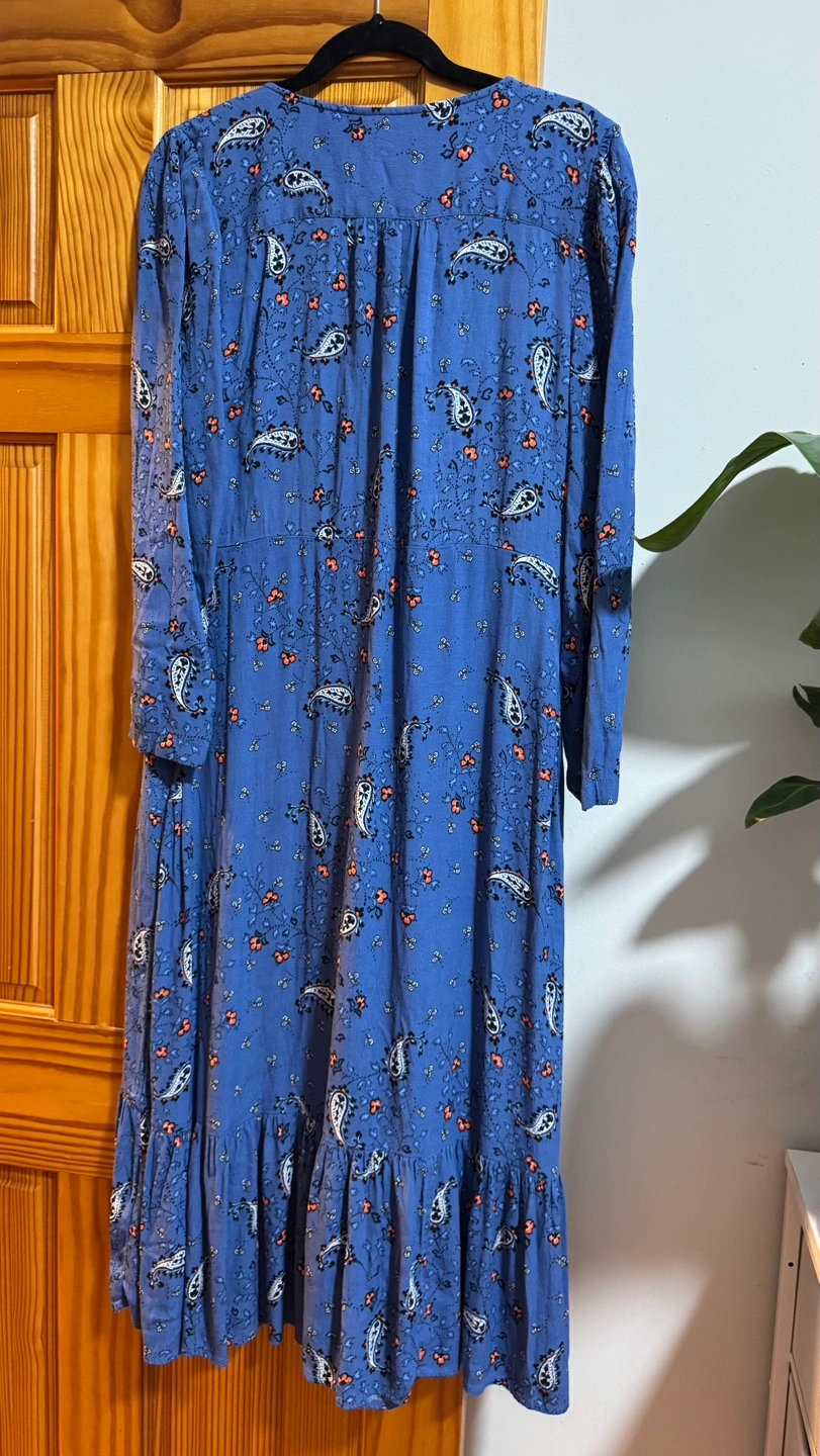 163Long sleeve maxi dress. Size 16. Blue paisley and floral print. Button front. Tiered skirt. Long sleeves.
