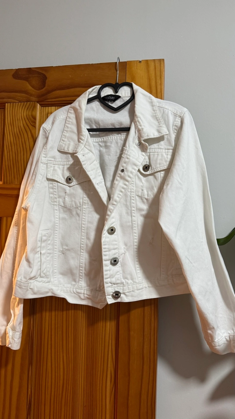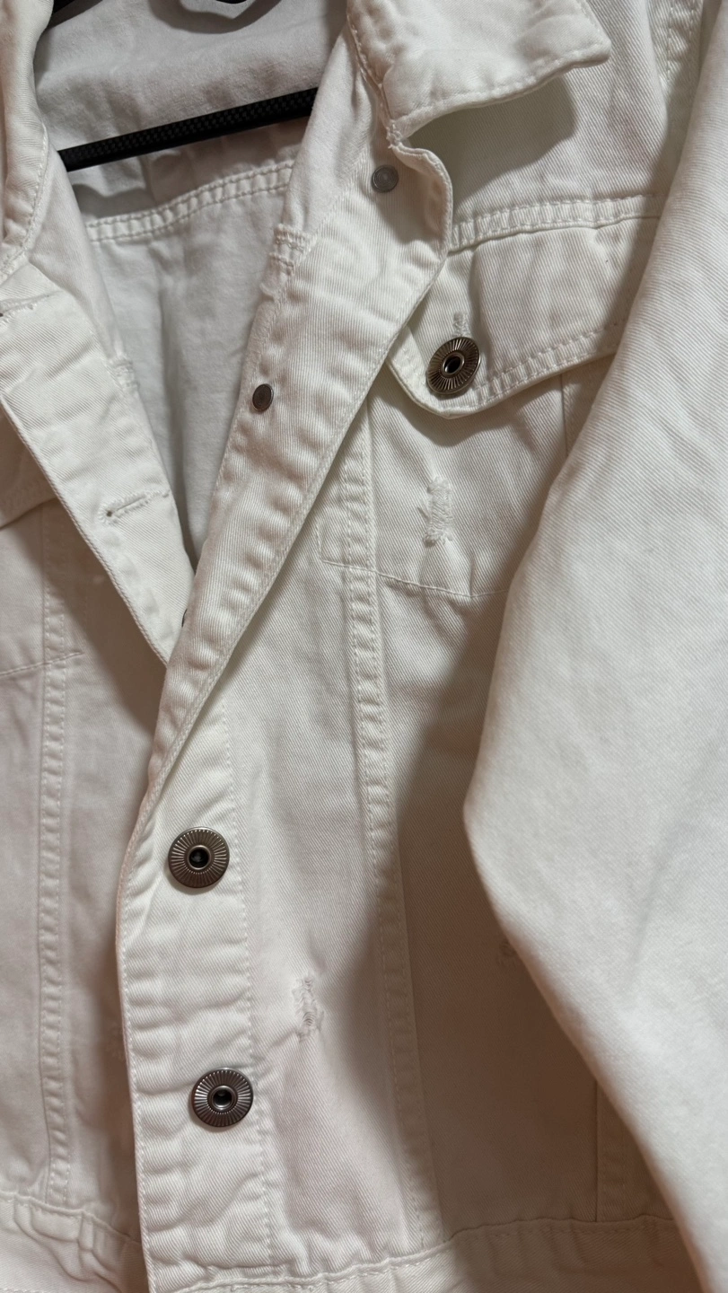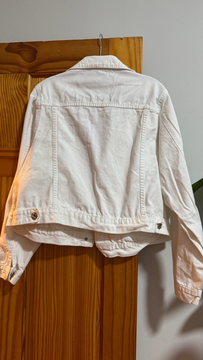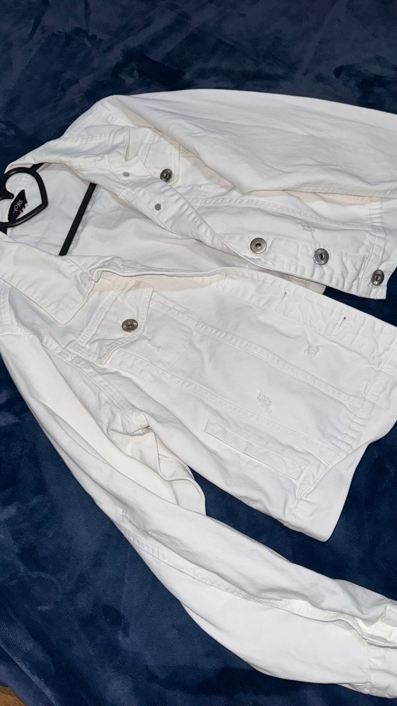 Cropped white denim jacket. Button closure. Long sleeves. Distressed detailing. Size large.