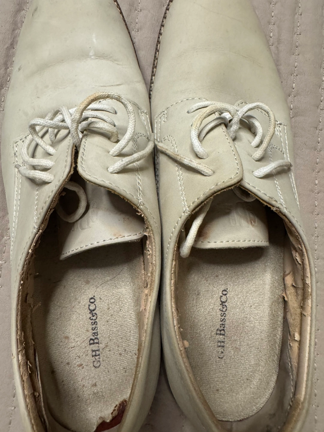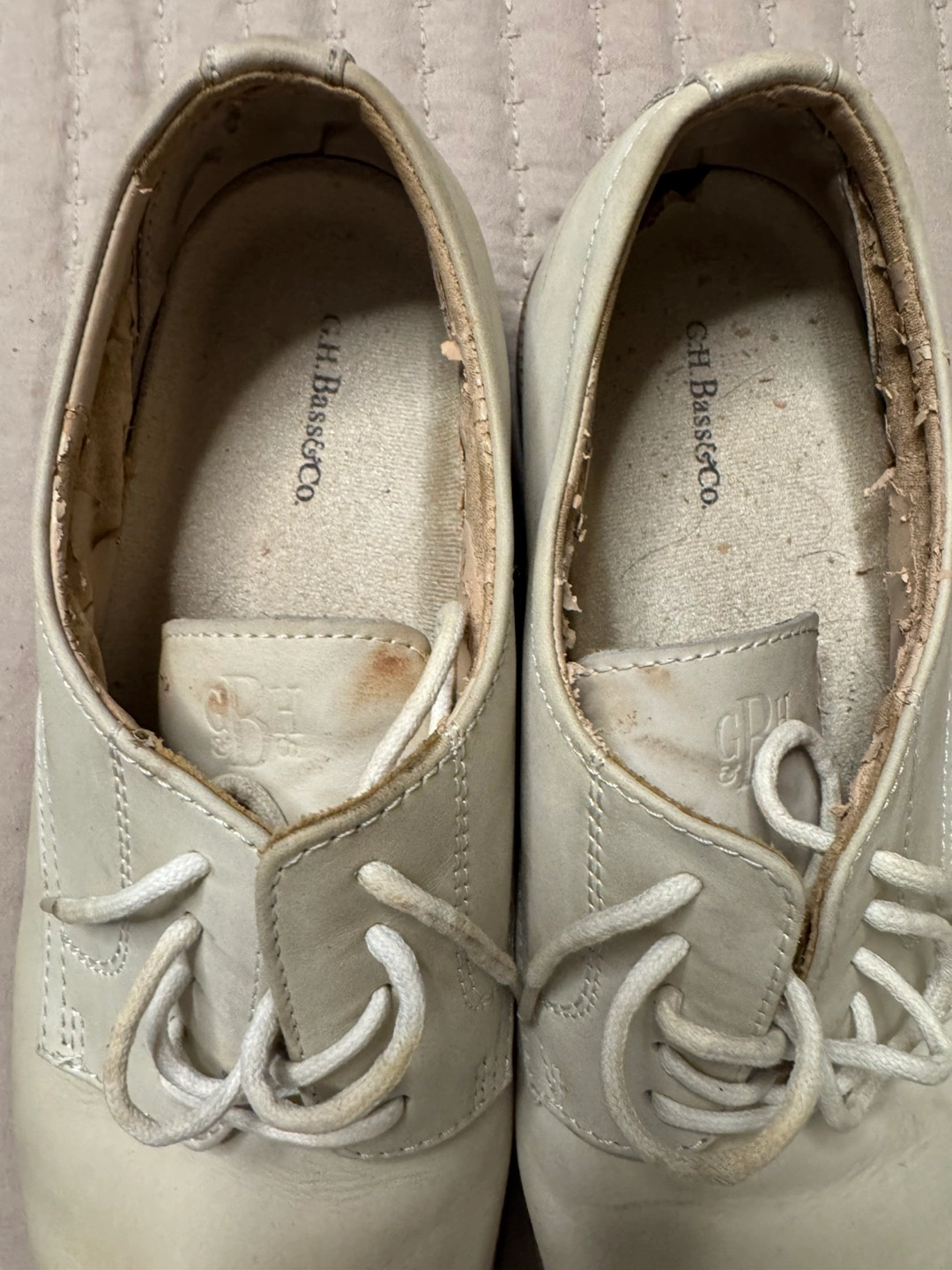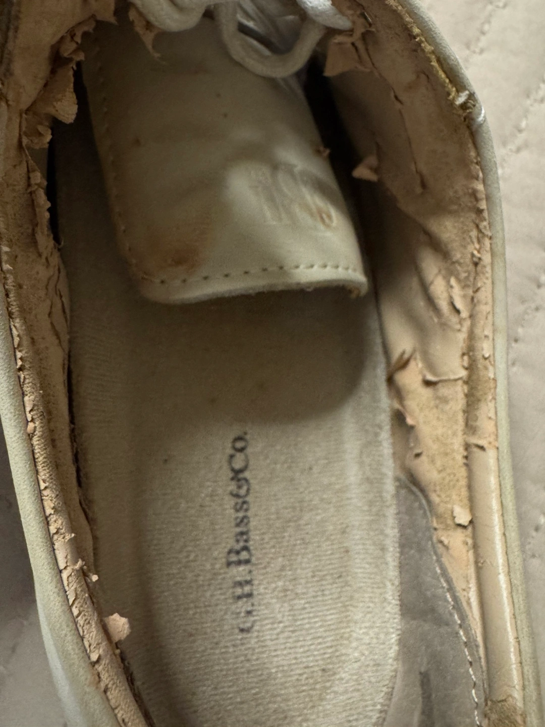 Pre-owned G.H. Bass & Co. men's oxfords. Off-white leather. Lace-up closure. Some wear and tear visible. See photos for details.check pictures inside the shoes is crack