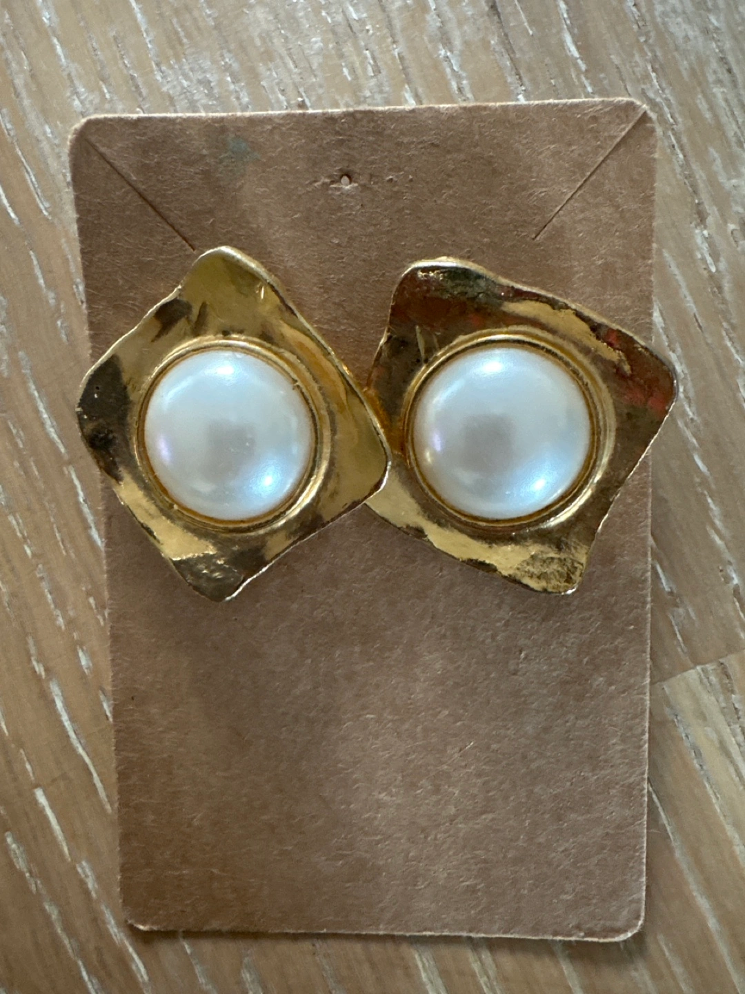 209Pair of gold tone square stud earrings. Features faux pearls. Post backings.