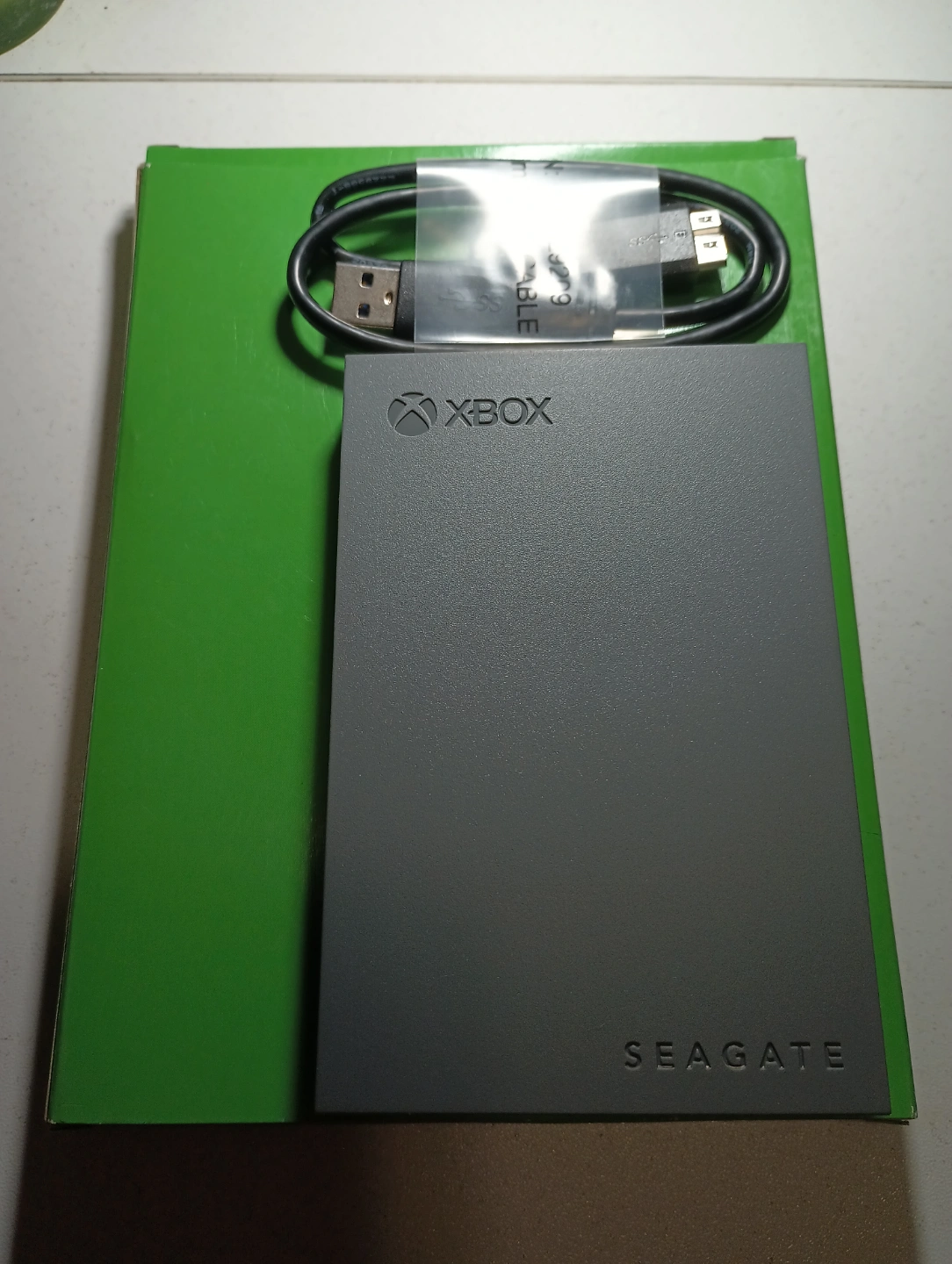 Gray external hard drive. Xbox logo. USB cable included. Green box.