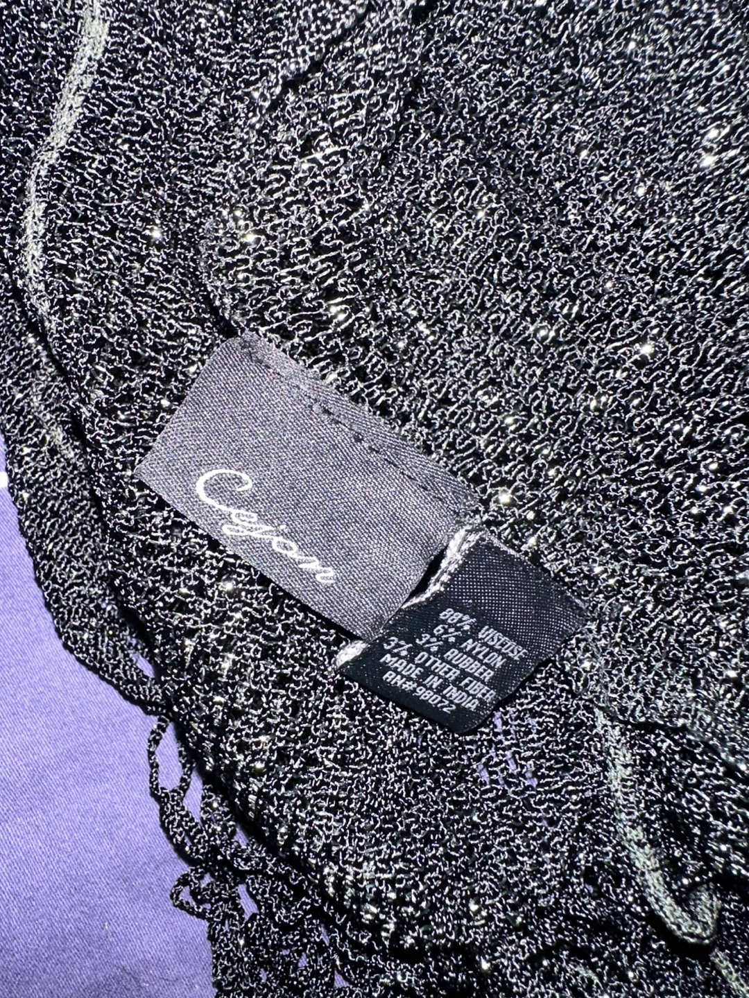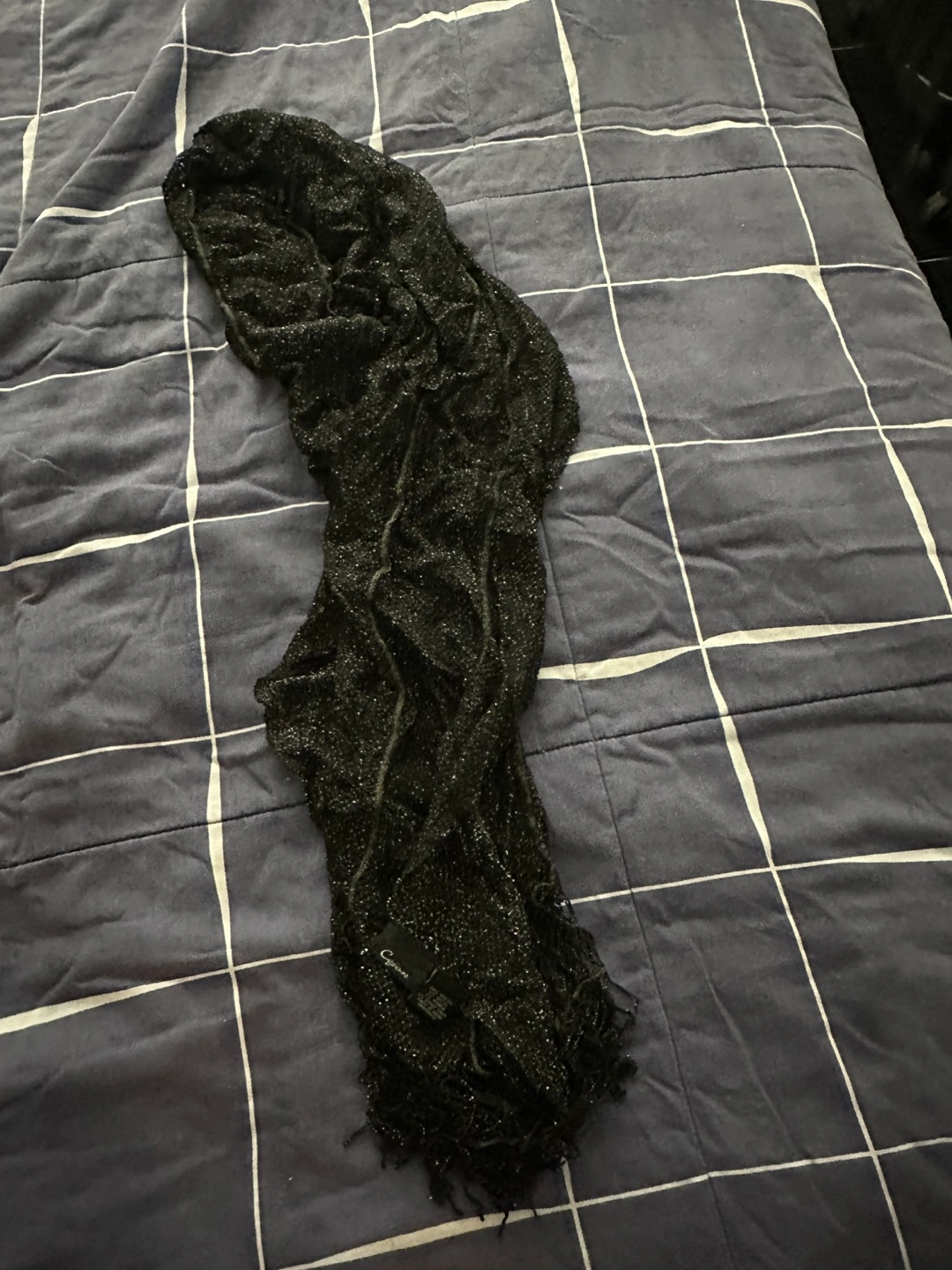84Beautiful black sparkly scarf. Features fringe detailing. Lightweight and perfect for any occasion. Perfect to party. I need to clean up my closet.