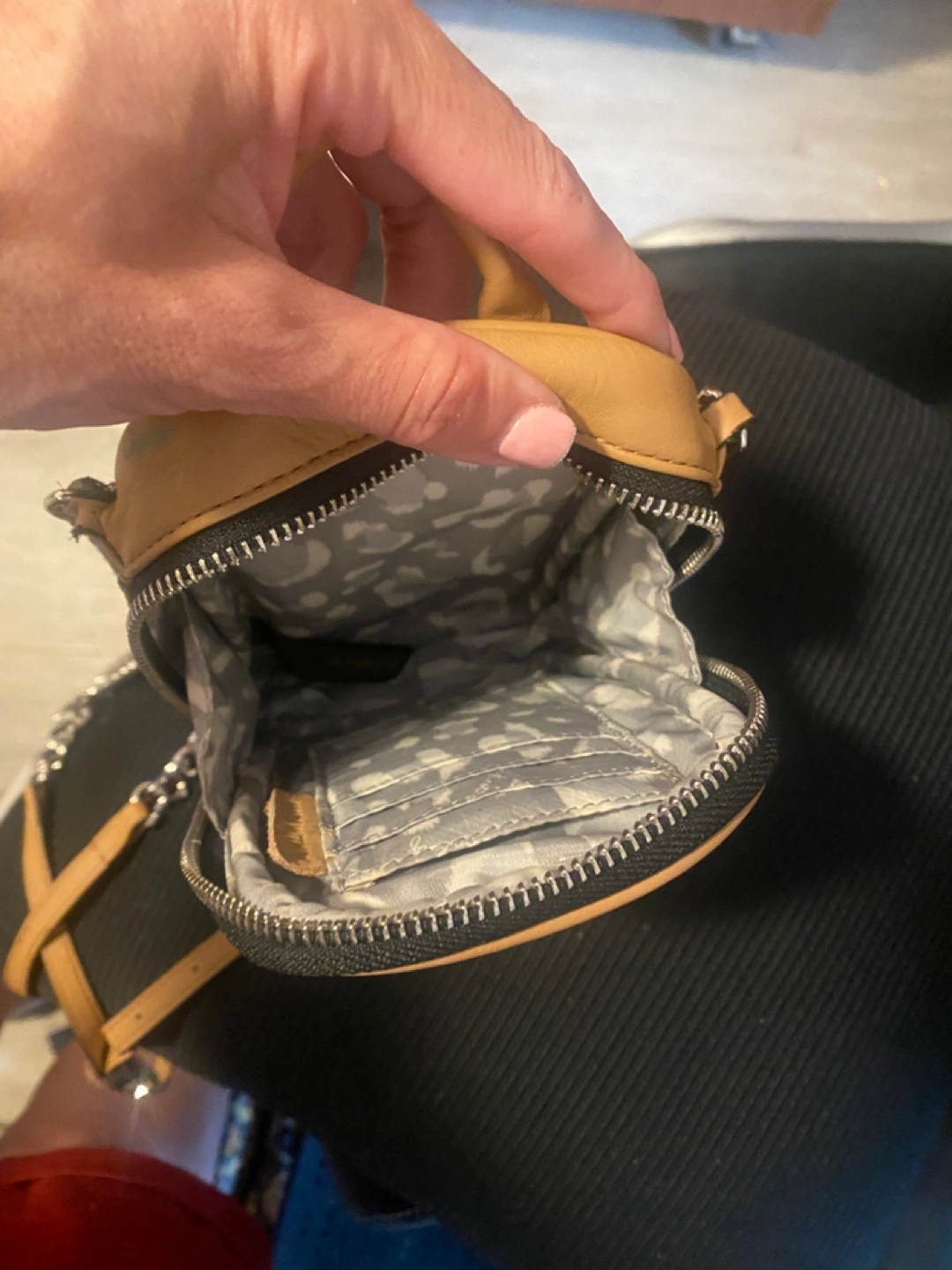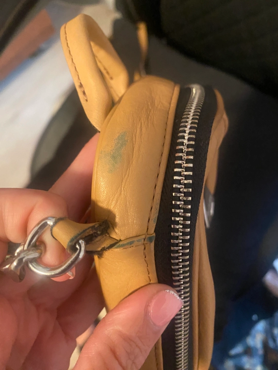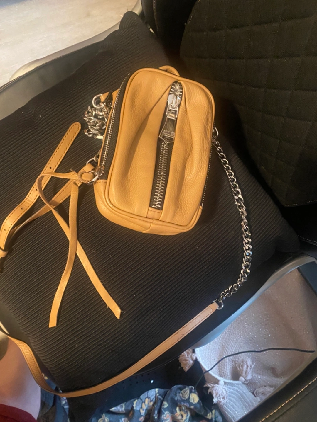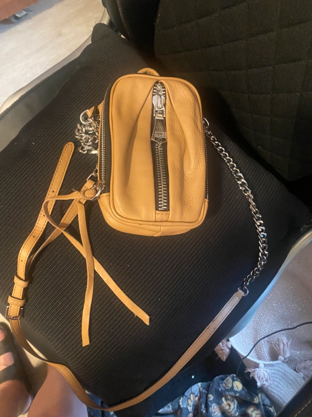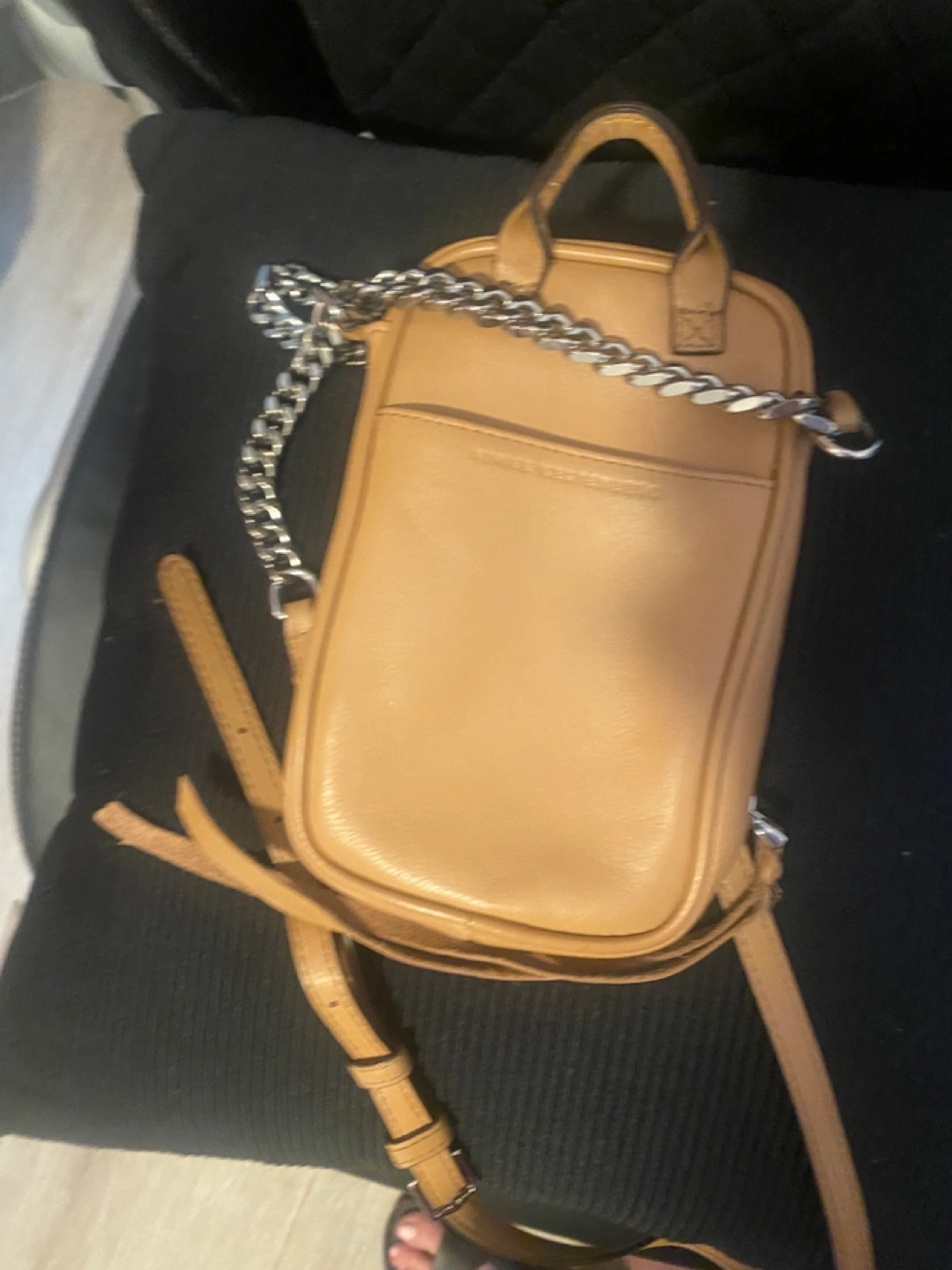 Tan leather mini crossbody bag. Features a silver chain strap and zipper closure. Small interior pockets. Perfect for everyday use. See pictures for one small color transfer Approximately 5x7x1.5 Pick up in Bensonhurst bklyn Text 347-366-4713