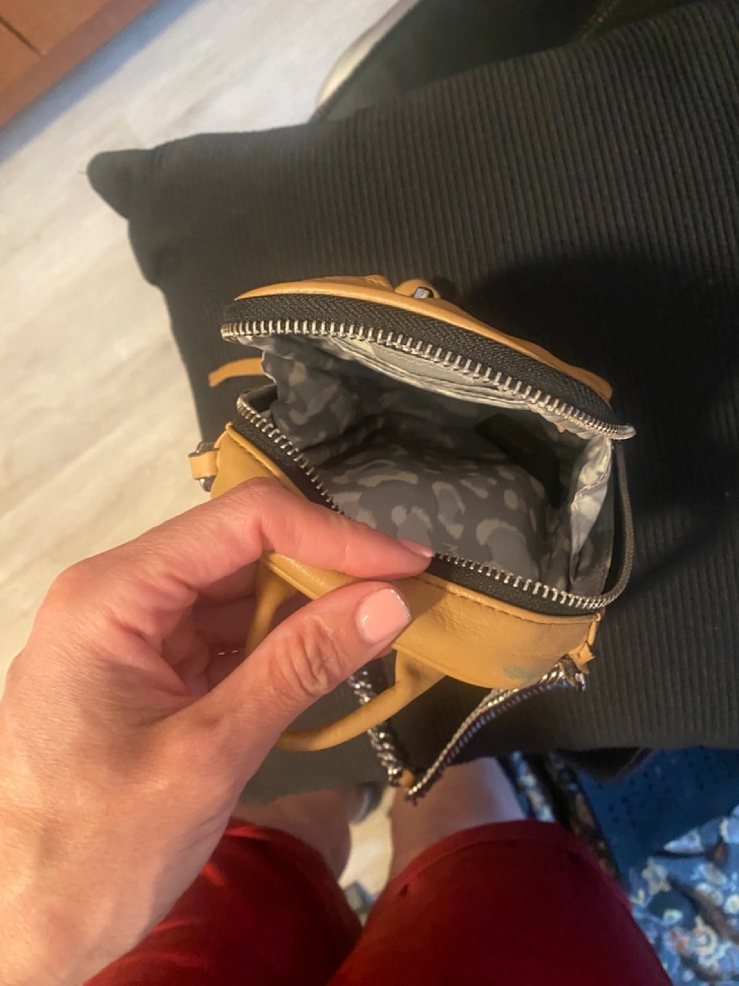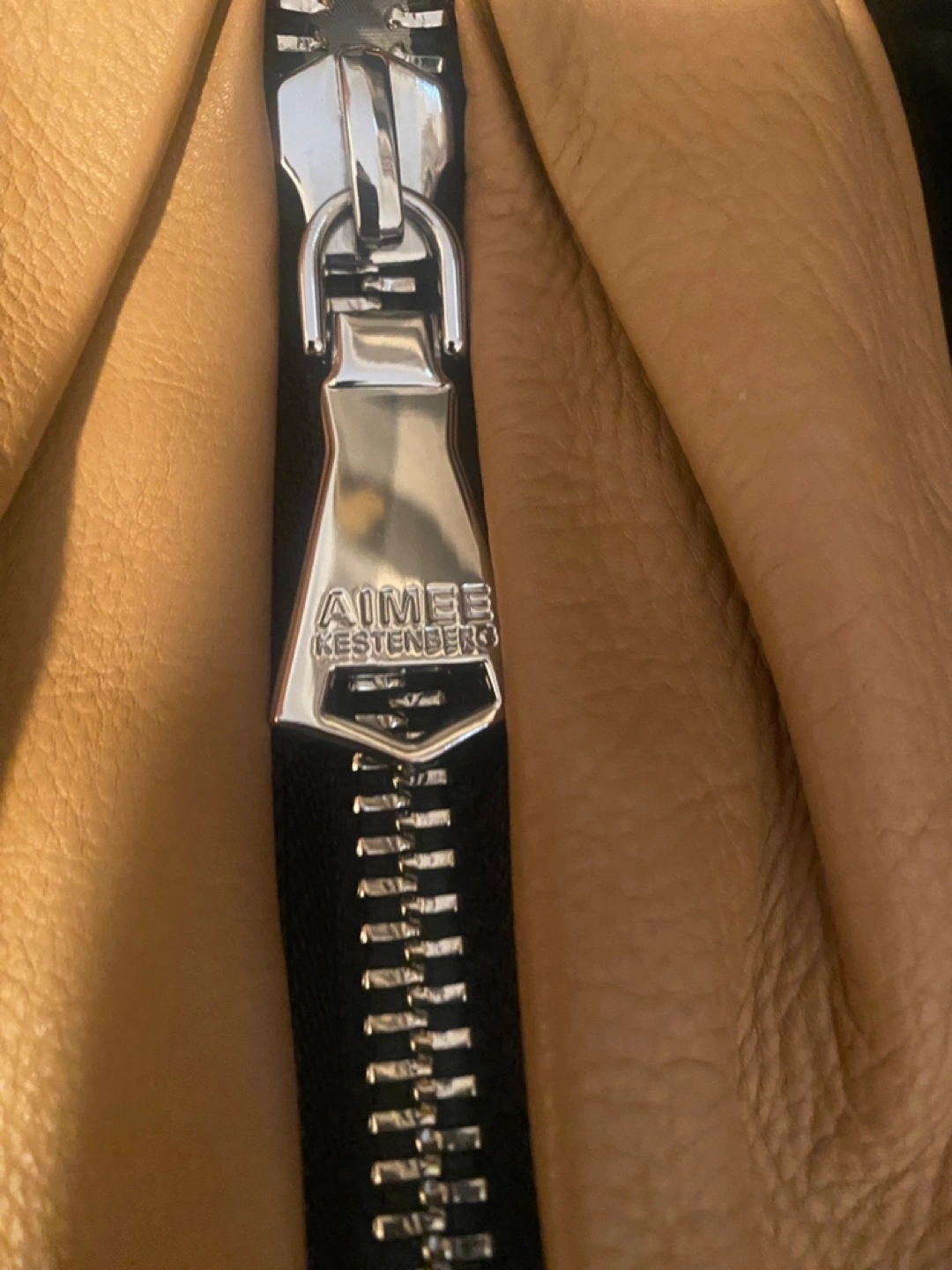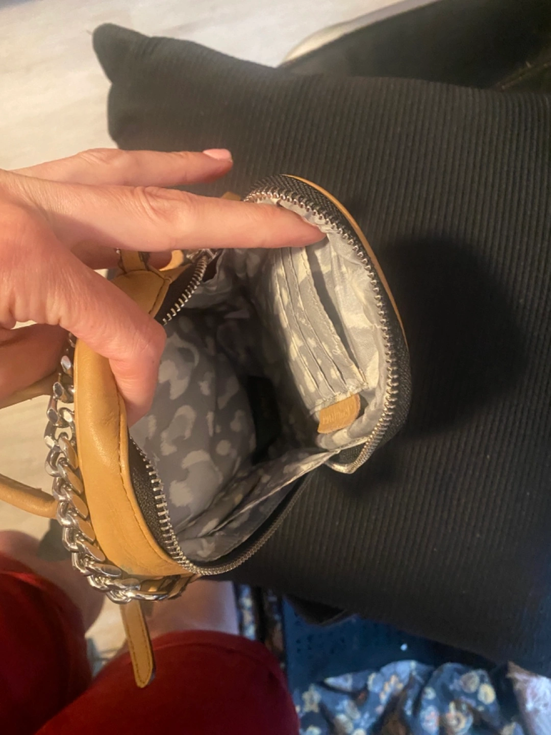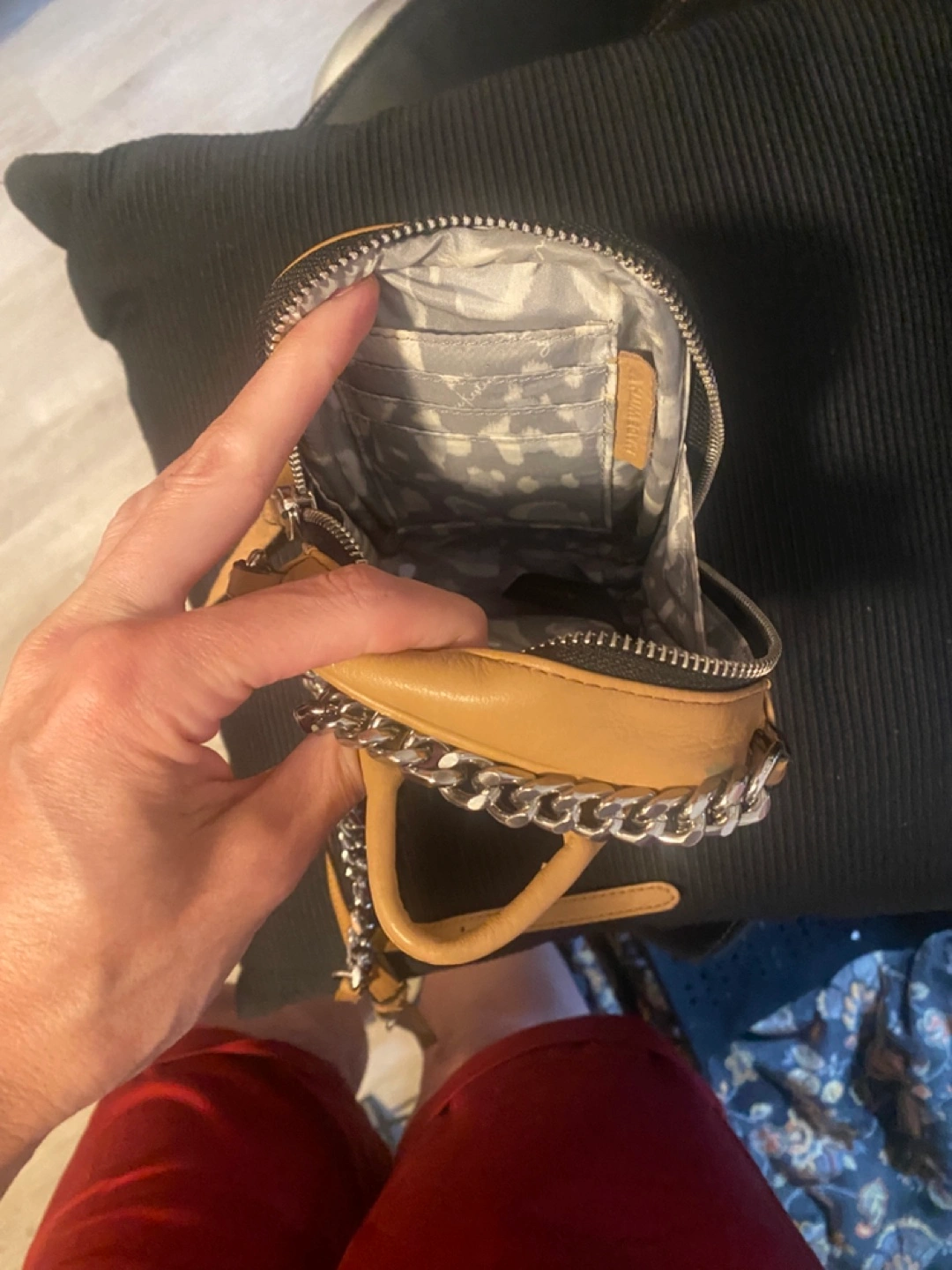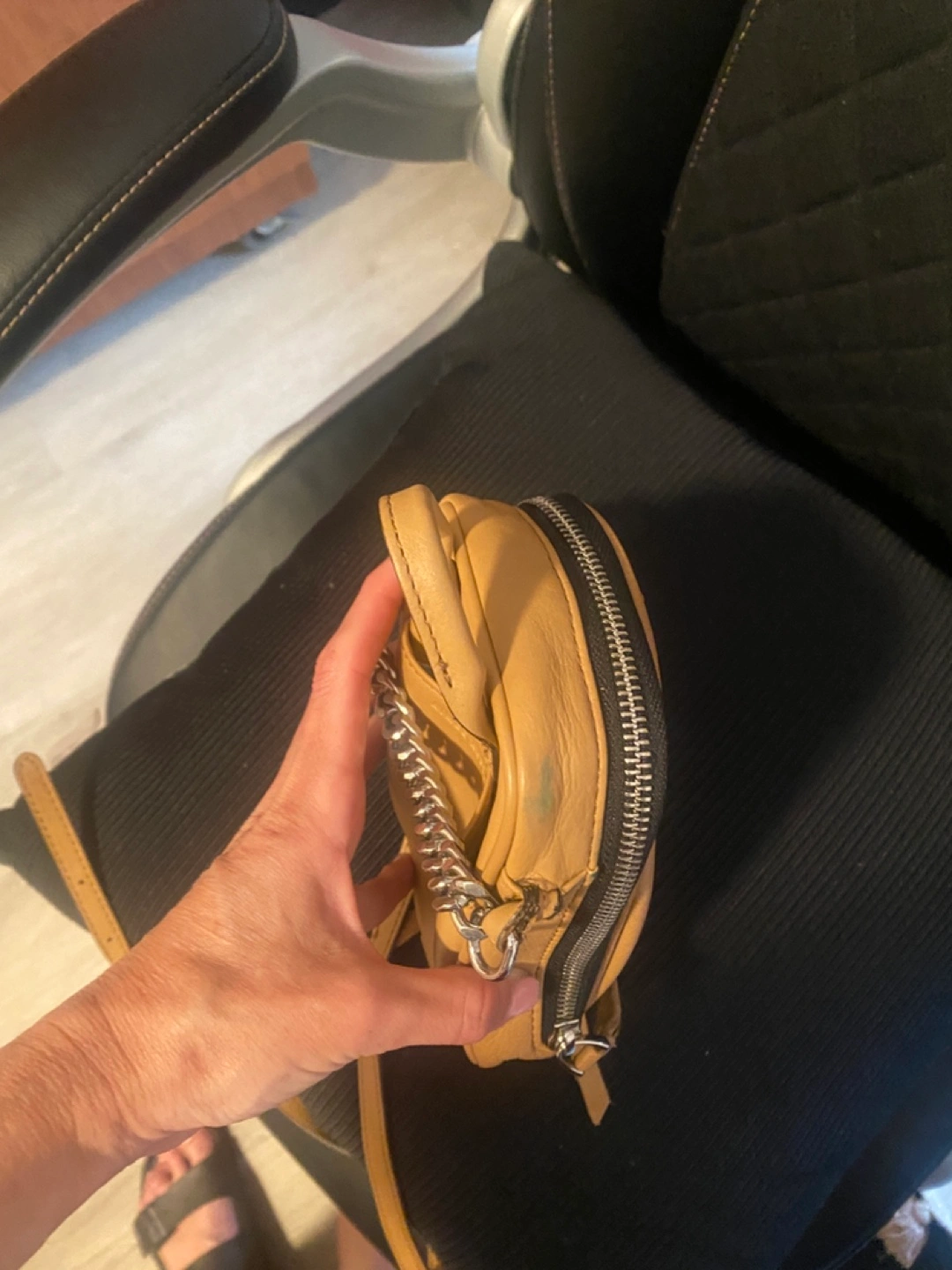 Tan leather mini crossbody bag. Features a silver chain strap and zipper closure. Small interior pockets. Perfect for everyday use. See pictures for one small color transfer Approximately 5x7x1.5 Pick up in Bensonhurst bklyn Text 347-366-4713