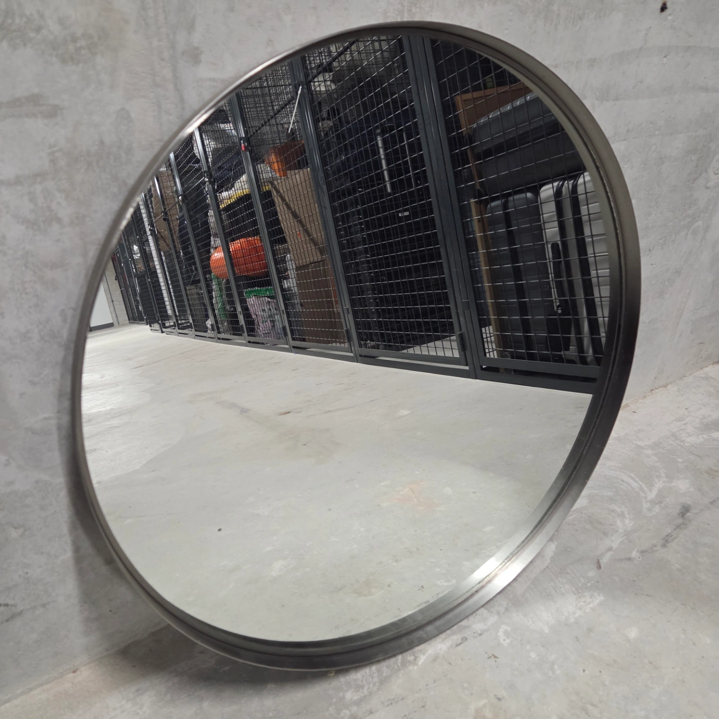 76Large round mirror. Silver metal frame. Perfect for any room.