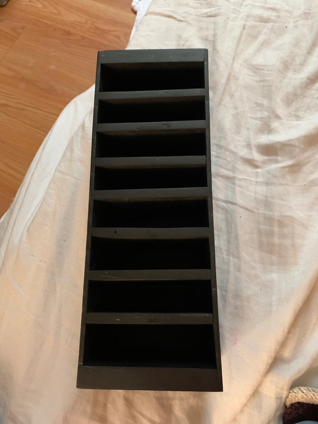 Tall, narrow, black wooden organizer. Ten equal-sized compartments. Perfect for storing small items. 13.5 inches long BY 5 inches wide BY 5 inches deep