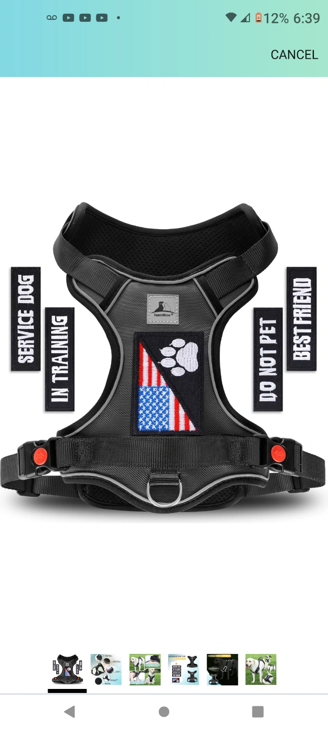 Tactical Dog Harness - Medium - Black/Grey - Service Dog Patches Medium tactical dog harness. Black and grey. Includes removable patches: Service Dog, In Training, Do Not Pet, Best Friend, and an American flag patch. Durable and adjustable.