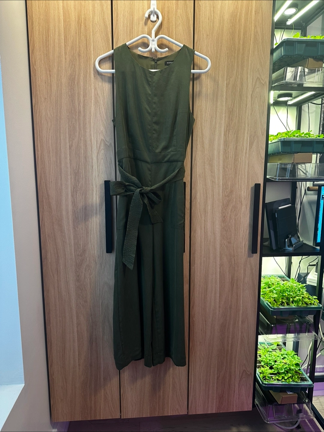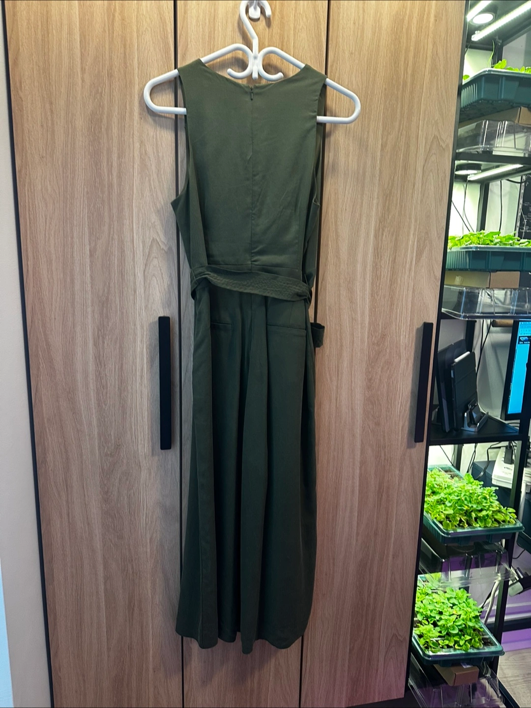 Olive green sleeveless jumpsuit. Features a lined top, self-tie waist belt and pockets. Looks great for a casual or semi-formal occasion.