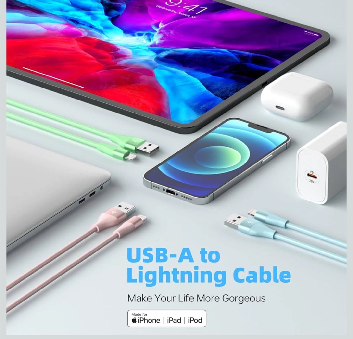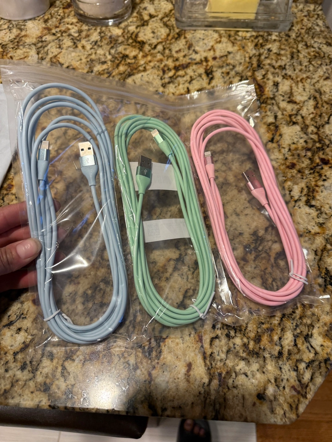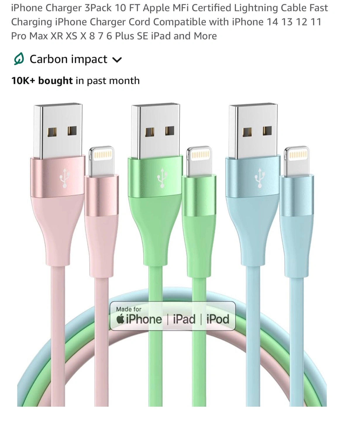 1603 pack of 10ft pastel-colored Apple MFi certified Lightning cables. Compatible with iPhone, iPad, and iPod. Fast charging and data transfer. Pick up Irving Park & Cumberland