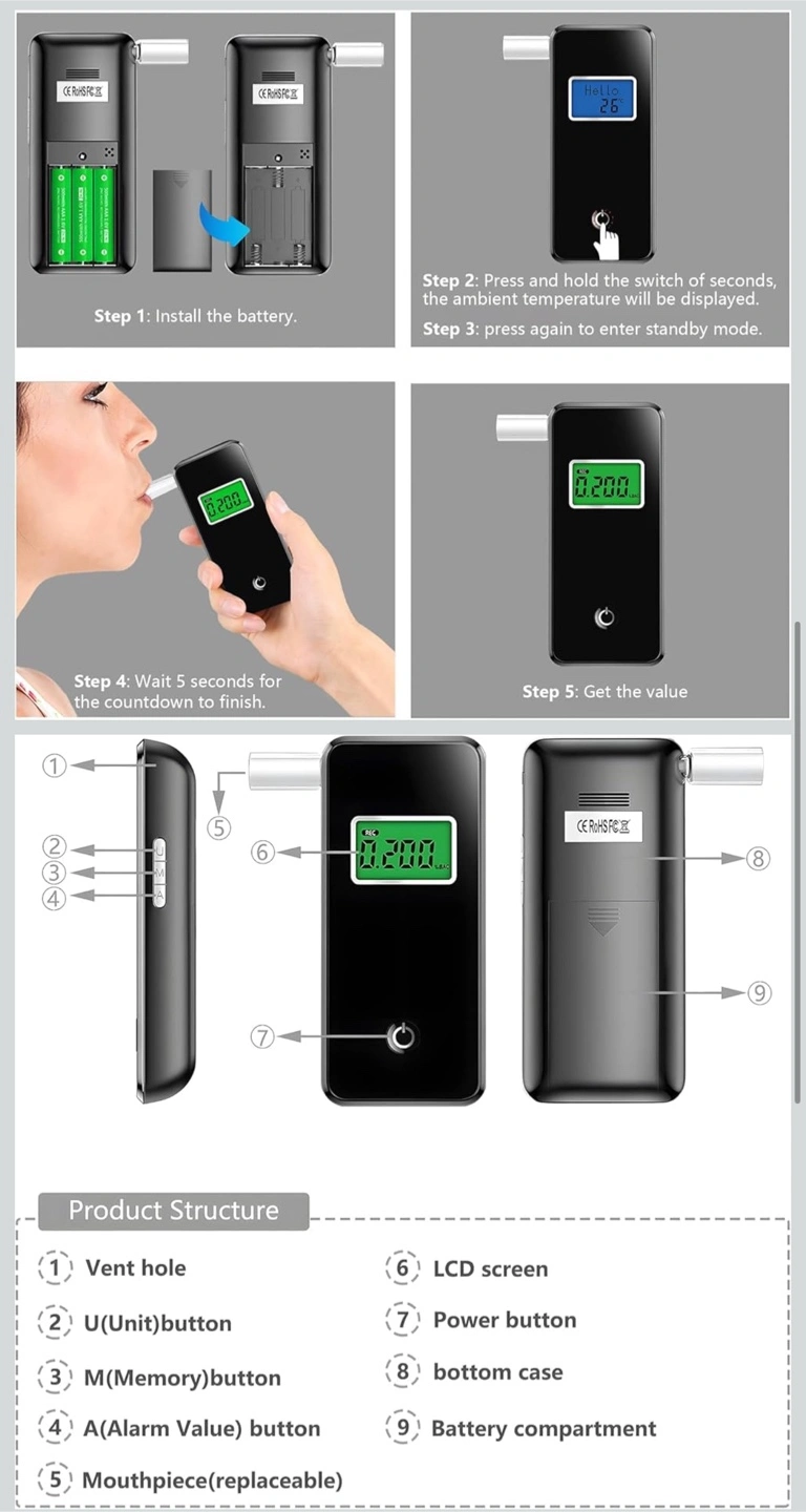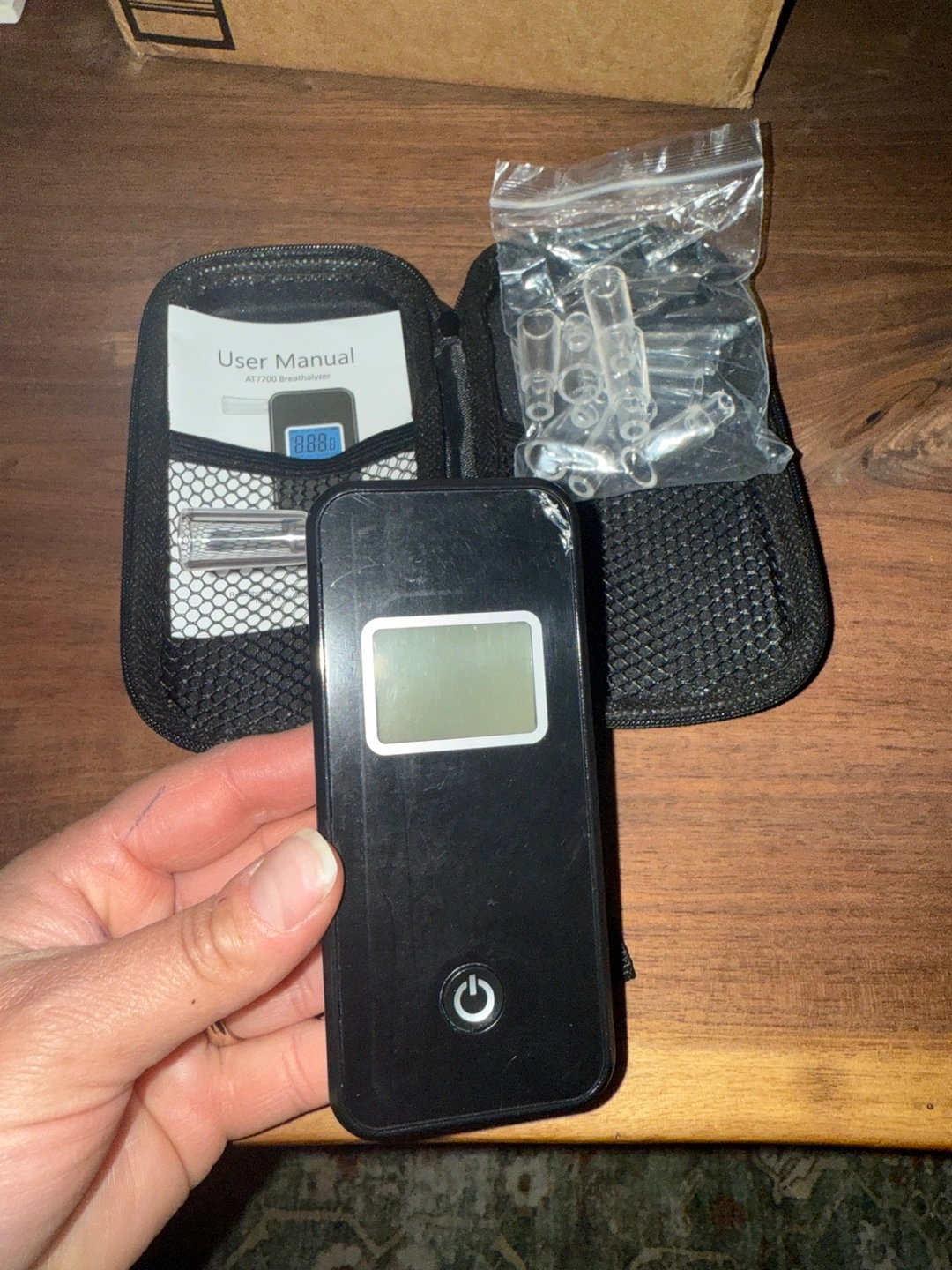 Professional-grade alcohol tester. High-accuracy readings. Includes LCD display, temperature sensor, and memory function. Comes with carrying case and 10 mouthpieces. Easy to use. Pick up around Irving Park and Cumberland