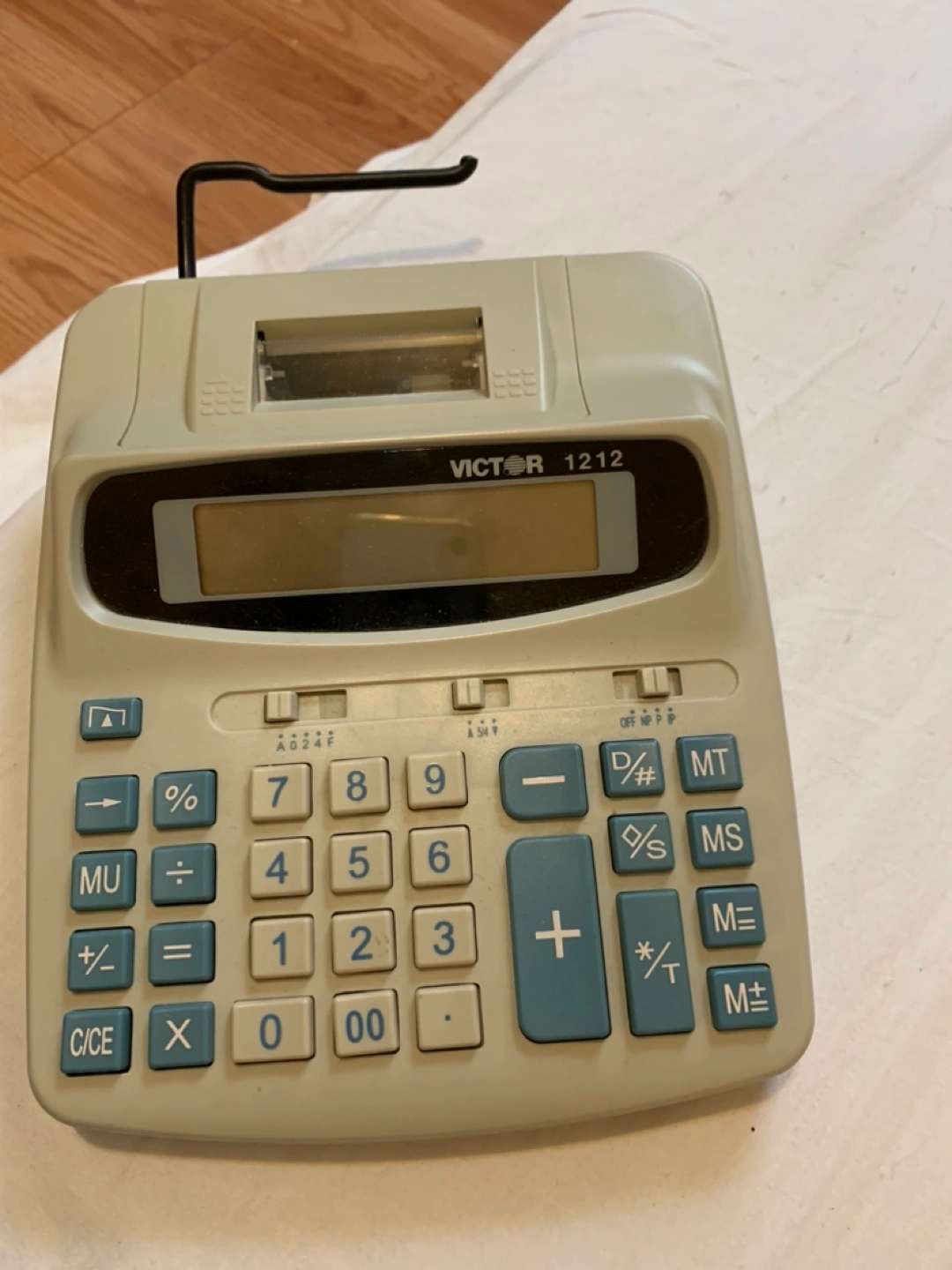 Vintage Victor 1212 printing calculator. Features a large display and a standard calculator layout. Good for adding and subtracting. Adapter includedš§”
