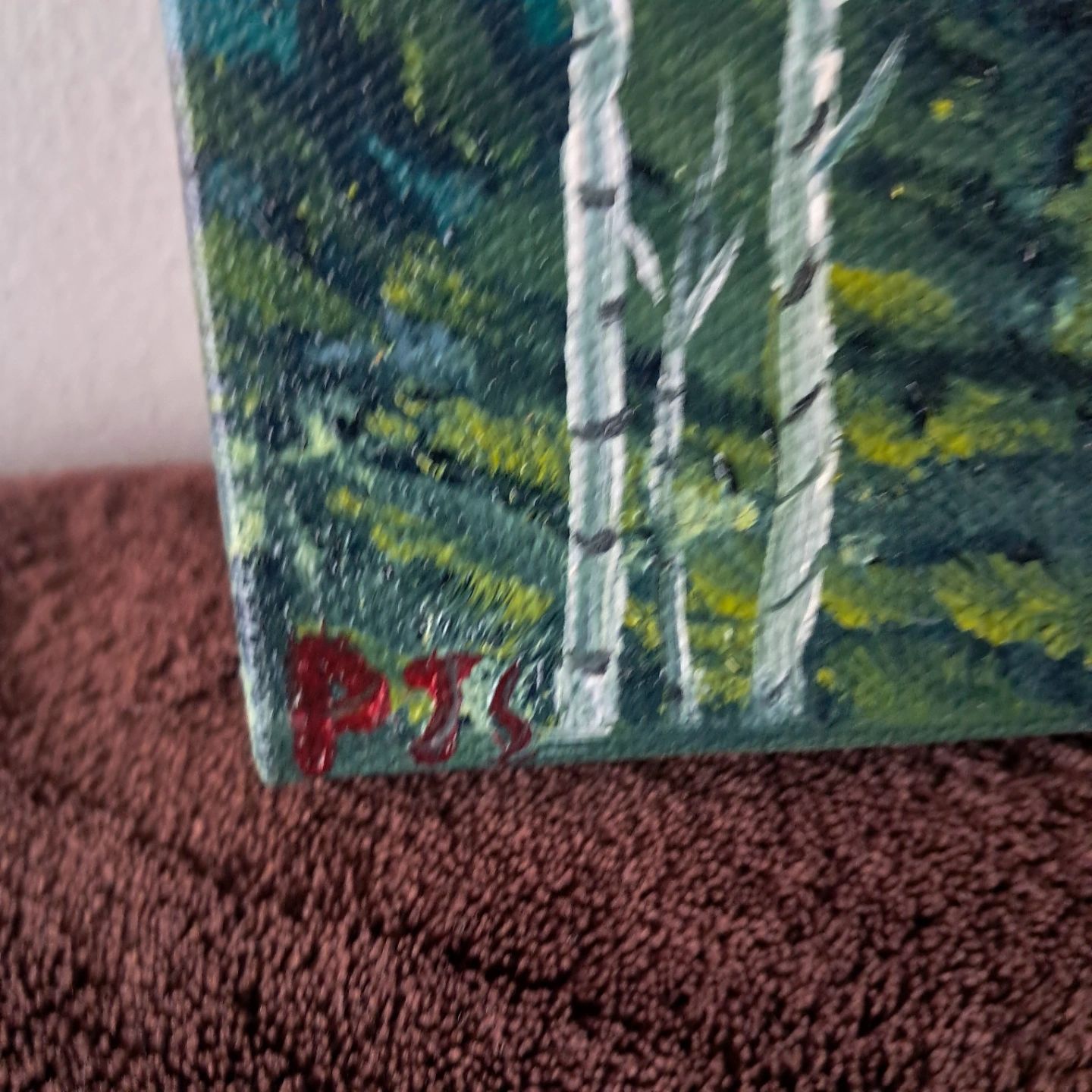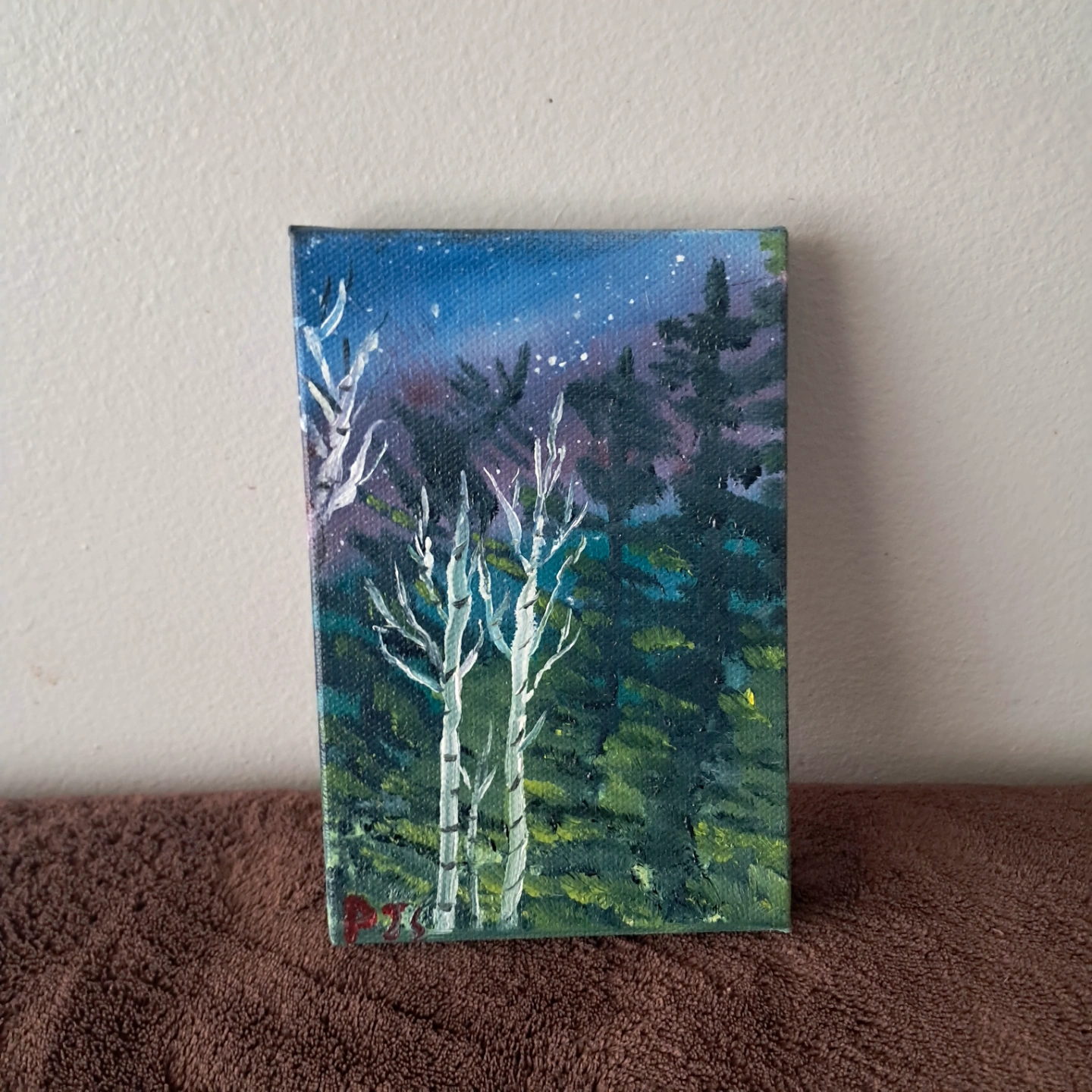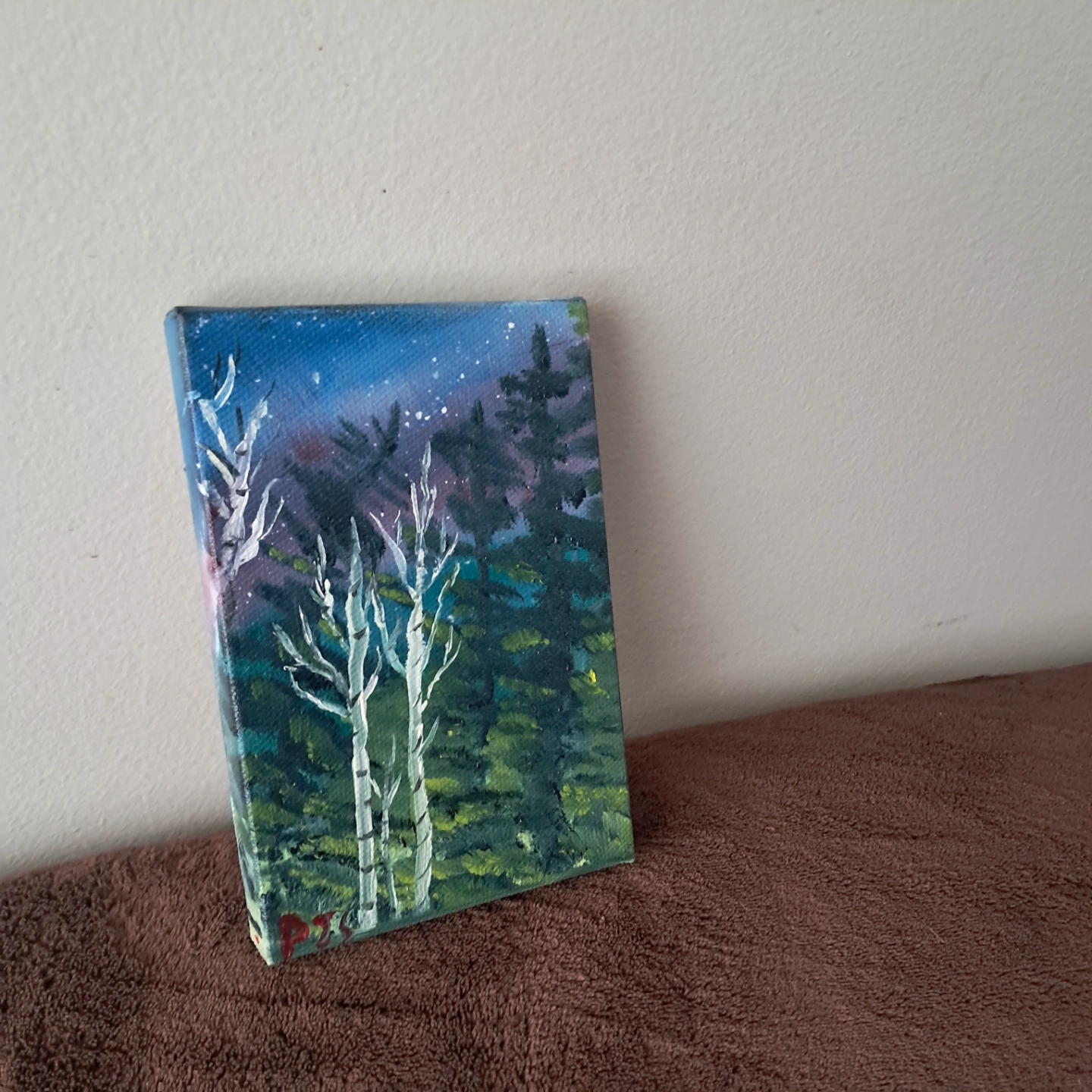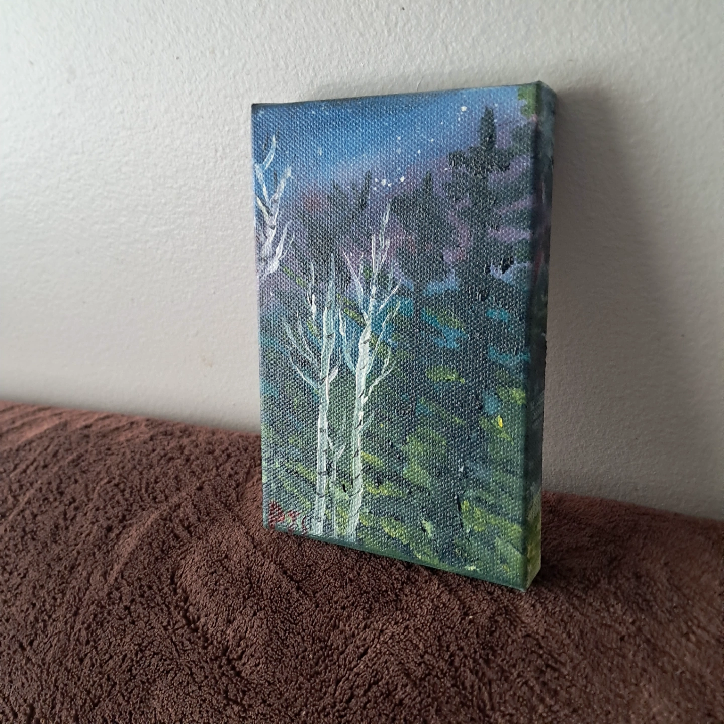15Small canvas painting. Features birch trees and evergreens. Nighttime scene. Artist signature on front and back.4x6