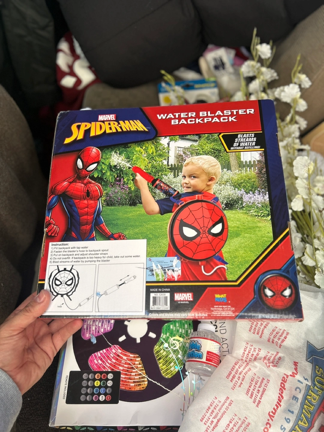 234New Spiderman water blaster backpack. Includes backpack, water gun, and bubble solution. Fun for summer! Ages 3+