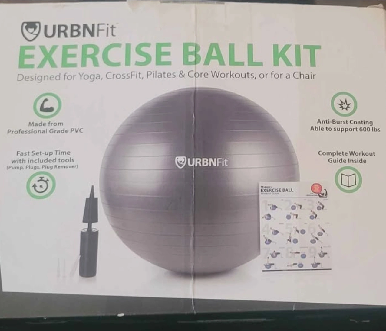 NEW exercise ball kit. Includes ball, exercise guide and pump. Anti-burst coating, supports up to 600 lbs. Great for yoga, CrossFit, Pilates, and core workouts. It is 55cm/22in Pickup in River Grove.