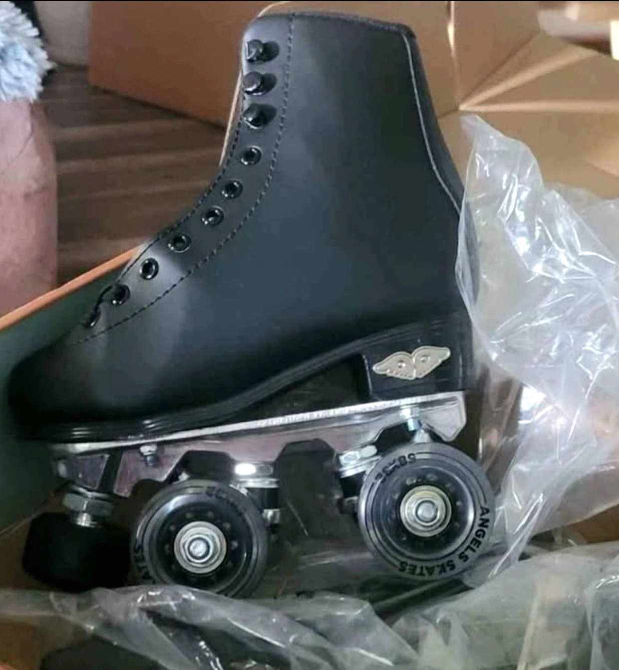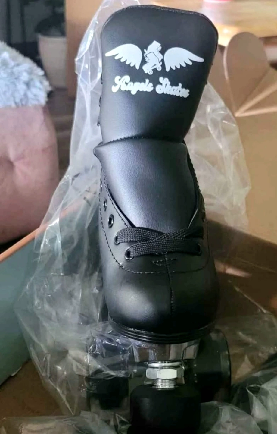 NEW Kids Size 1, Black quad roller skates. High-top design. Lace-up closure. Silver trucks and wheels. New in box. Pickup in River Grove