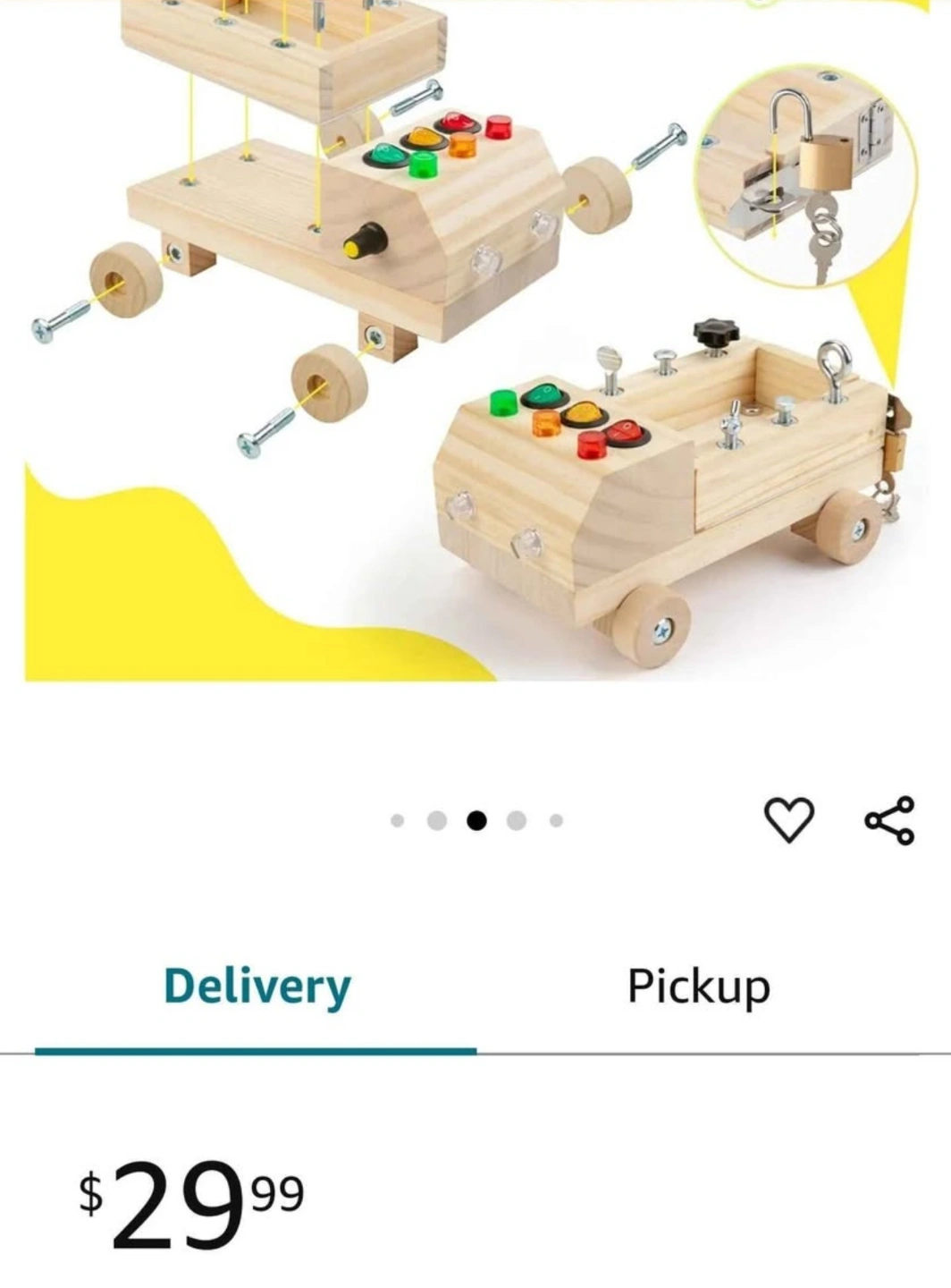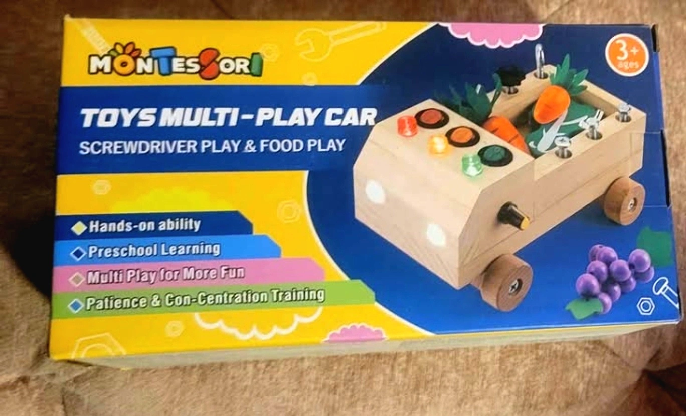 NEW Wooden toy car. Includes screwdriver, bolts, nuts, and pretend food. Great for preschool learning. Develops hand-eye coordination and problem-solving skills. Multi-functional design offers various play options. Promotes patience and concentration. Pickup in River Grove