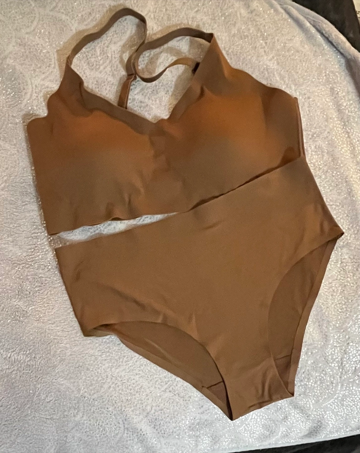 Brown wireless bra and high-waisted underwear set. Comfortable and seamless design. Perfect for everyday wear. Compared to store price - panty is FREE!